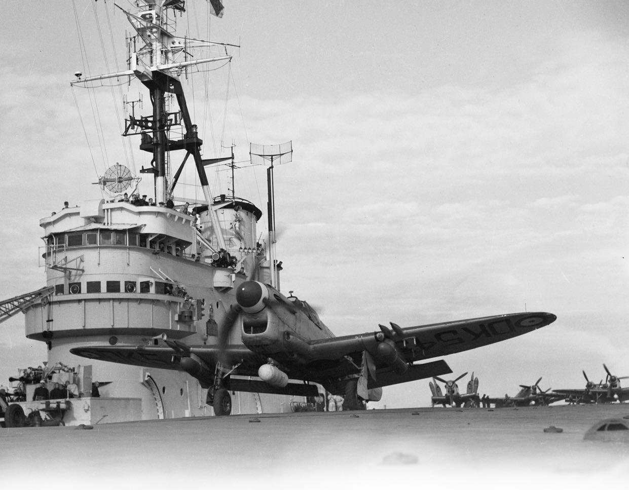 Only the body of Hearle, 812’s Senior Pilot was recovered by destroyer for burial at sea the following day. Nat Hearle, disembarked from Glorious in 1940 and operating under the RAF’s Coastal Command, had flown minelaying and bombing operations along the coasts of Holland, Belgium and France until his Fairey Swordfish L2819 was shot down in August. He and his observer spent the rest of the war as prisoners.