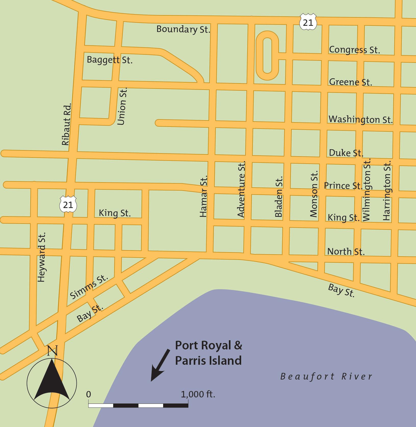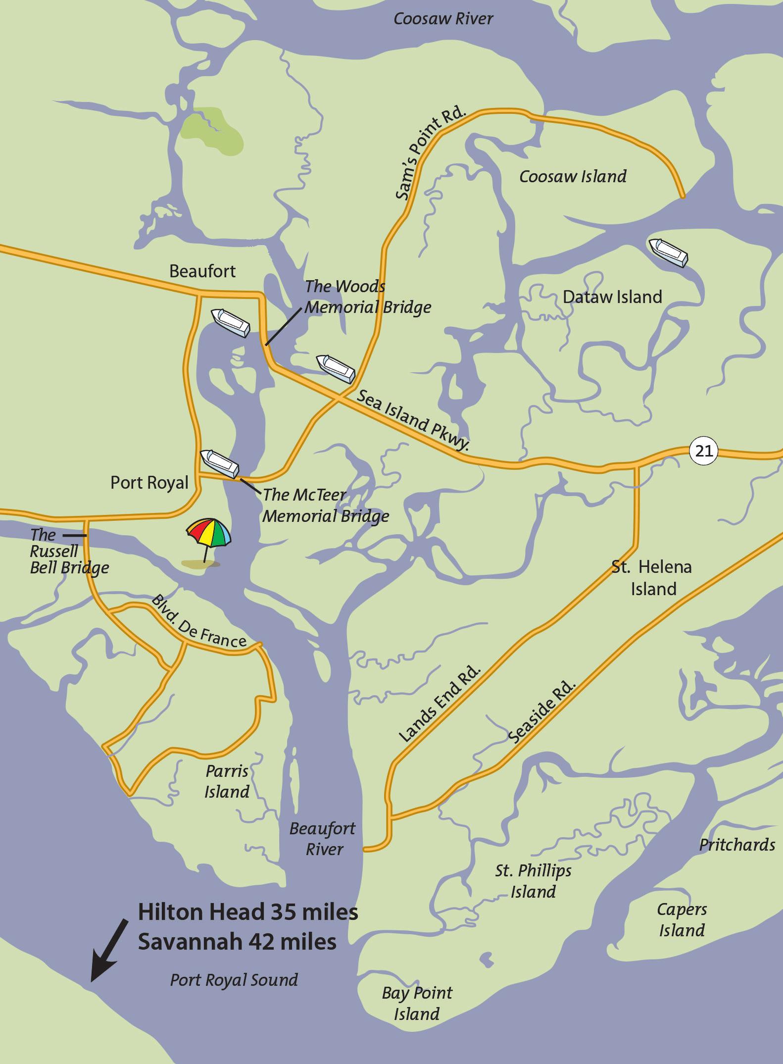 Beaufort sits along U.S. 21, U.S. 278, and S.C. 170 — just a short jog from major north/ south routes U.S. 17 and I-95.