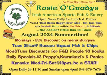 Rosie O’Gradys Irish Pub, in Beaufort Town Center. Irish American Sports Pub & Eatery. C'mon down! Rock & Roll Lunch. Weekly Food Specials! Mondays - F&B People Discount. Wednesdays, Friday & Saturday - Karaoke. (843) 379-7676 or Rosie's on Facebook