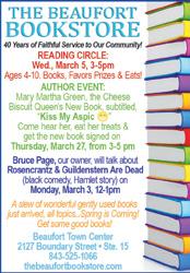 Mondays, Now – 3/10, Books Sandwiched In, hosted by Friends of the Beaufort Library. In this popular annual series, community members present books that are meaningful to them. Light refreshments. Noon–1pm at USCB Center for the Arts, Beaufort. For a full schedule of presenters and books, visit www.friendsofthebeaufortlibrary.com