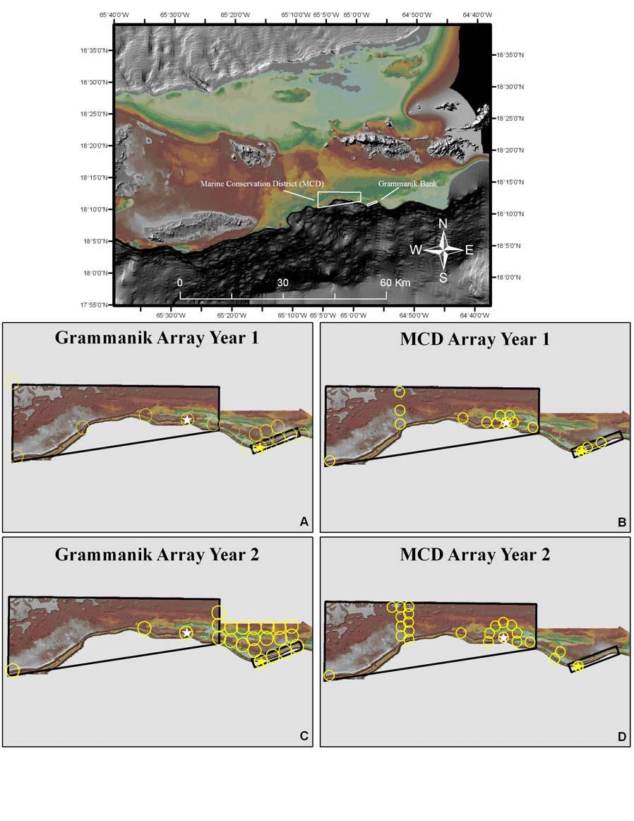 Data analysis - Data downloaded from the receivers were used to produce maps of grouper movements superimposed over the high resolution bathymetric data and habitat maps produced by NOAA and the Caribbean Fisheries Management Council (CFMC) for the MCD and Grammanik Bank. These maps provided detailed information on the daily, monthly and seasonal movement patterns around the spawning aggregation site, within the closure and in relation to the closure boundaries. The data will also document the dispersal and formation patterns of spawning aggregations of the 3 grouper species, interspecific patterns of movement and variations in movement associated with males and females before, during and after spawning.