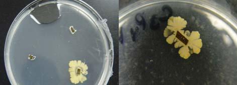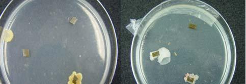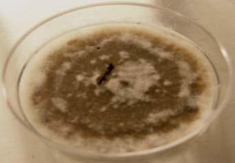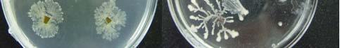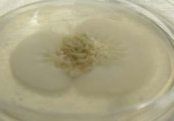 Biossays: The bioassays were performed by placing four sterile filter discs impregnated with the fungal extracts over the bacterial field at equidistant position from one another. In every dish we included a control disc, consisting of a filter disc impregnated with sterile water. We incubated the plates for 24 hours at 25ºC and made replicates that were incubated at 37ºC (Fig. 2). Observations were made after the incubation period to evaluate the interactions. The data was documented as inhibition of bacterial growth around the impregnated discs, promotion of bacterial growth (evidence of bacterial growth around the impregnated discs) or no interaction. Fungal isolates that promoted bacterial growth were prepared for observation under the Scanning Electron Microscopy (SEM).