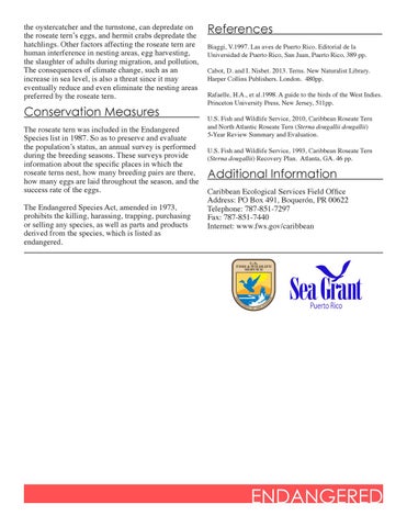 References Biaggi, V.1997. Las aves de Puerto Rico. Editorial de la Universidad de Puerto Rico, San Juan, Puerto Rico, 389 pp. Cabot, D. and I. Nisbet. 2013. Terns. New Naturalist Library. Harper Collins Publishers. London. 480pp. Rafaelle, H.A., et al.1998. A guide to the birds of the West Indies. Princeton University Press, New Jersey, 511pp. U.S. Fish and Wildlife Service, 2010, Caribbean Roseate Tern and North Atlantic Roseate Tern (Sterna dougallii dougallii) 5-Year Review Summary and Evaluation. U.S. Fish and Wildlife Service, 1993, Caribbean Roseate Tern (Sterna dougallii) Recovery Plan. Atlanta, GA. 46 pp.