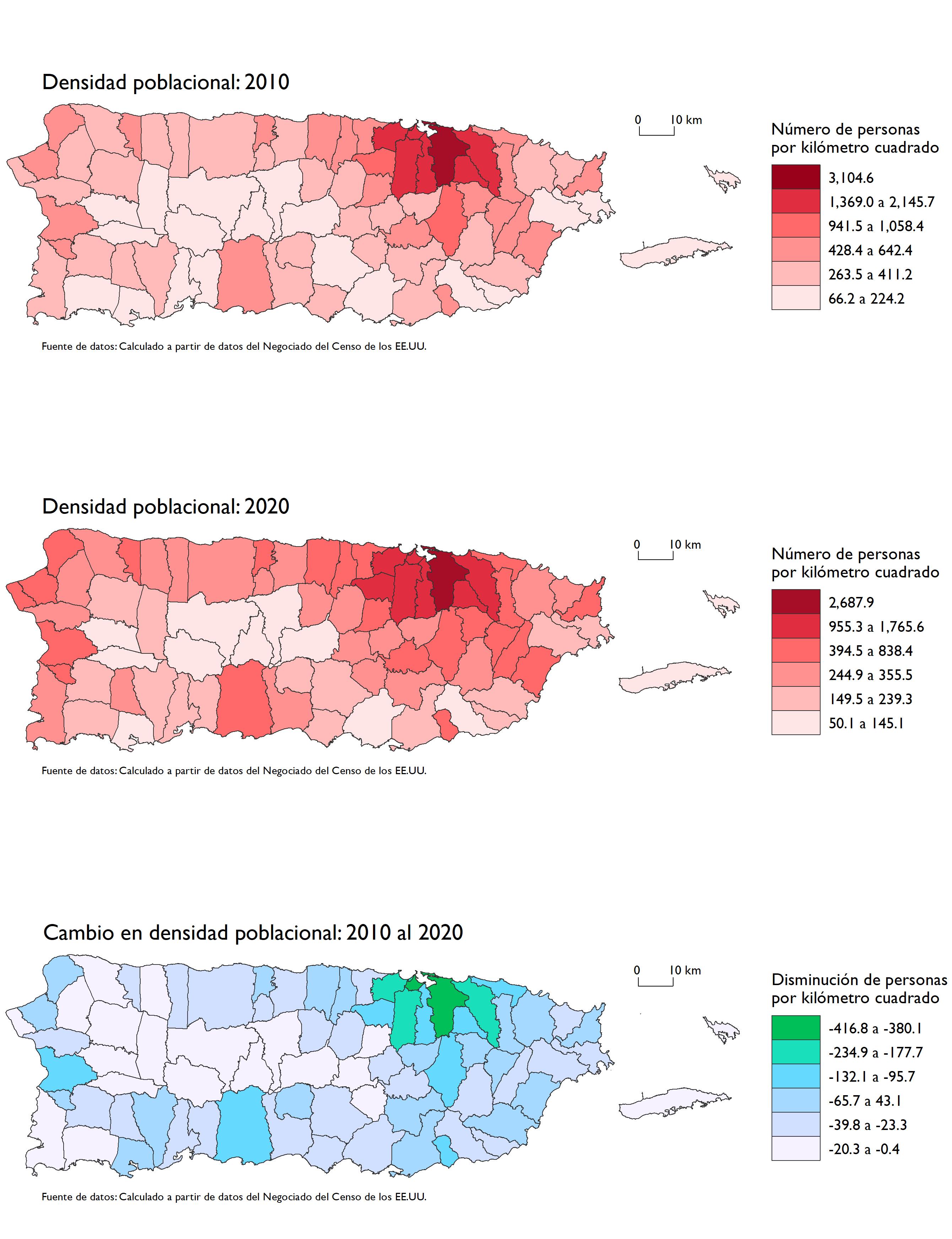 En términos de densidad poblacional, o sea, el número de personas por unidad de área, Puerto Rico tuvo una densidad de 420.2 personas/km2 en el año 2010. Ese año, los municipios con mayor densidad poblacional fueron San Juan, Cataño y Bayamón, con 3,104.6, 2,145.7 y 1,813.0 personas/km2, respectivamente [Mapa 6]. Mientras, los municipios con menor densidad fueron Maricao, Culebra y Vieques, con 66.2, 68.2 y 69.9 personas/km2, respectivamente. Para el año 2020, la densidad poblacional de Puerto Rico fue de 370.5 personas/km2. Los municipios con mayor densidad poblacional ese año fueron, nuevamente, San Juan, Cataño y Bayamón, con 2,687.9, 1,765.6 y 1,613.3 personas/km2, respectivamente [Mapa 7]. Por otra parte, y como en el año 2010, los municipios con menor densidad poblacional en el año 2020 fueron Maricao, Vieques y Culebra, con 50.1, 62.0 y 67.3 personas/km2, respectivamente.