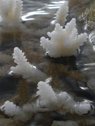 Los corales que se encuentran en las fotos están pasando por un proceso conocido como blanqueamiento. Esto ocurre cuando el coral se estresa debido al aumento de la temperatura del agua de mar. Al estresarse, expulsan las algas unicelulares que viven en sus tejidos llamadas zooxantelas. Estas microalgas le dan color y alimento, y el coral, a su vez, le provee hogar. Al expulsarse esta alga del cuerpo de este organismo, se hace notable el esqueleto de carbonato de calcio debajo del tejido del coral. Si la causa del estrés continúa, este animal (coral) puede morir.