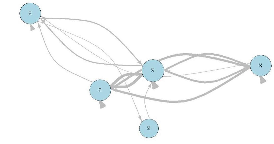 Network methods have allowed for better visualization of the movement patterns of bonefish among receivers, especially given such a large dataset (Finn et al. 2014). For these methods weighted average of detections are used to create movement paths between receivers or ‘nodes’, and the proportional frequency of movement is indicated by the thickness of the edges (arrows) and lines. As an example, the bonefish (#30425) in Figure 3 was only detected on receivers in Dakity, with the majority of movements occurring between receivers D6, D5, and D7.