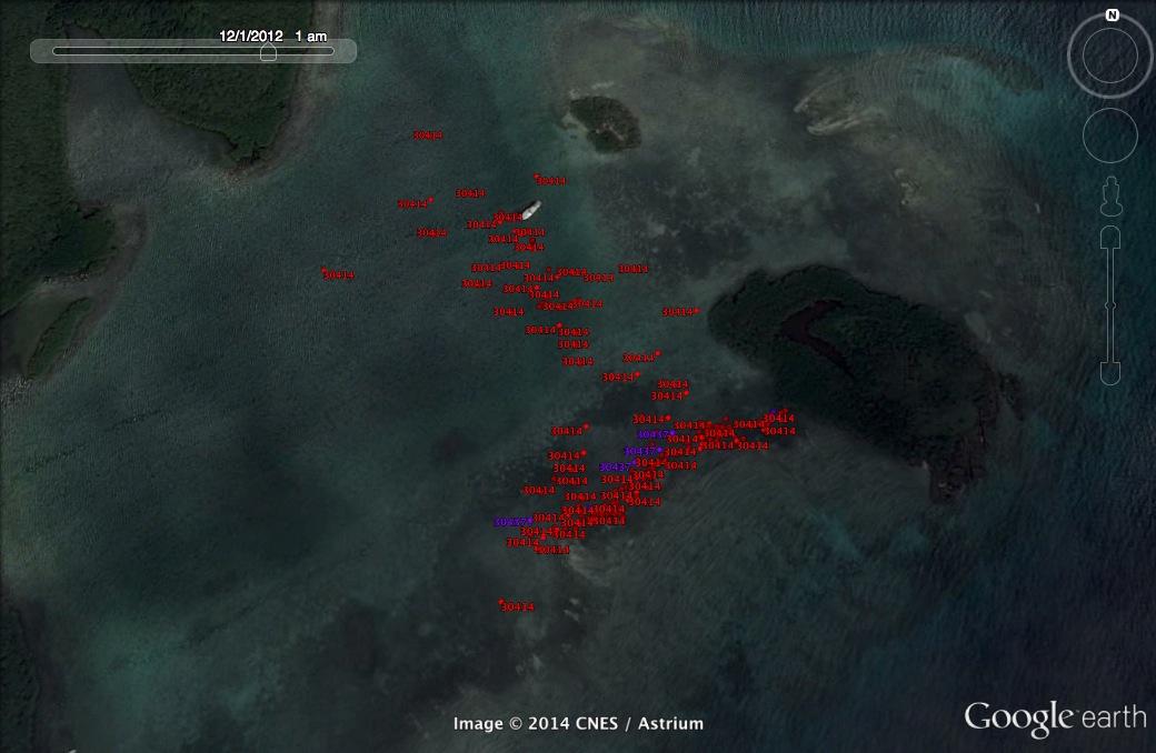 Mapping of the habitat within the VPS has allowed us to quantify habitat-specific temporal use of bonefish. Although we waiting for VEMCO to return the position data from the final download in January 2015, visual modeling of the current data is revealing considerable variation in spatial habitat use on a daily basis. For example, bonefish #30414 had a much more constrained spatial range during the day versus dusk, night, and dawn (Figure 7). This broader spatial range covered several different habitat types, including the sandy lagoon zone. Other patterns that are unfolding are related to tidal cycle, with bonefish not moving up on the reef crest even when water depths are greater during high tides. The high resolution of this data will permit the clear identification of essential habitats for bonefish on a fine spatial and temporal scale.