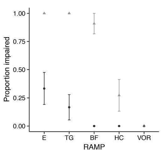 Figure 9: Proportion of reflexes impaired (reflex action mortality predictors; RAMP) in bonefish immediately after angling events and air exposed for 2 min (grey triangles) or no air exposure (black circles). E=equilibrium, TG=tail grab, BF=body flex, HC=head complex, VOR=vestibular-ocular response