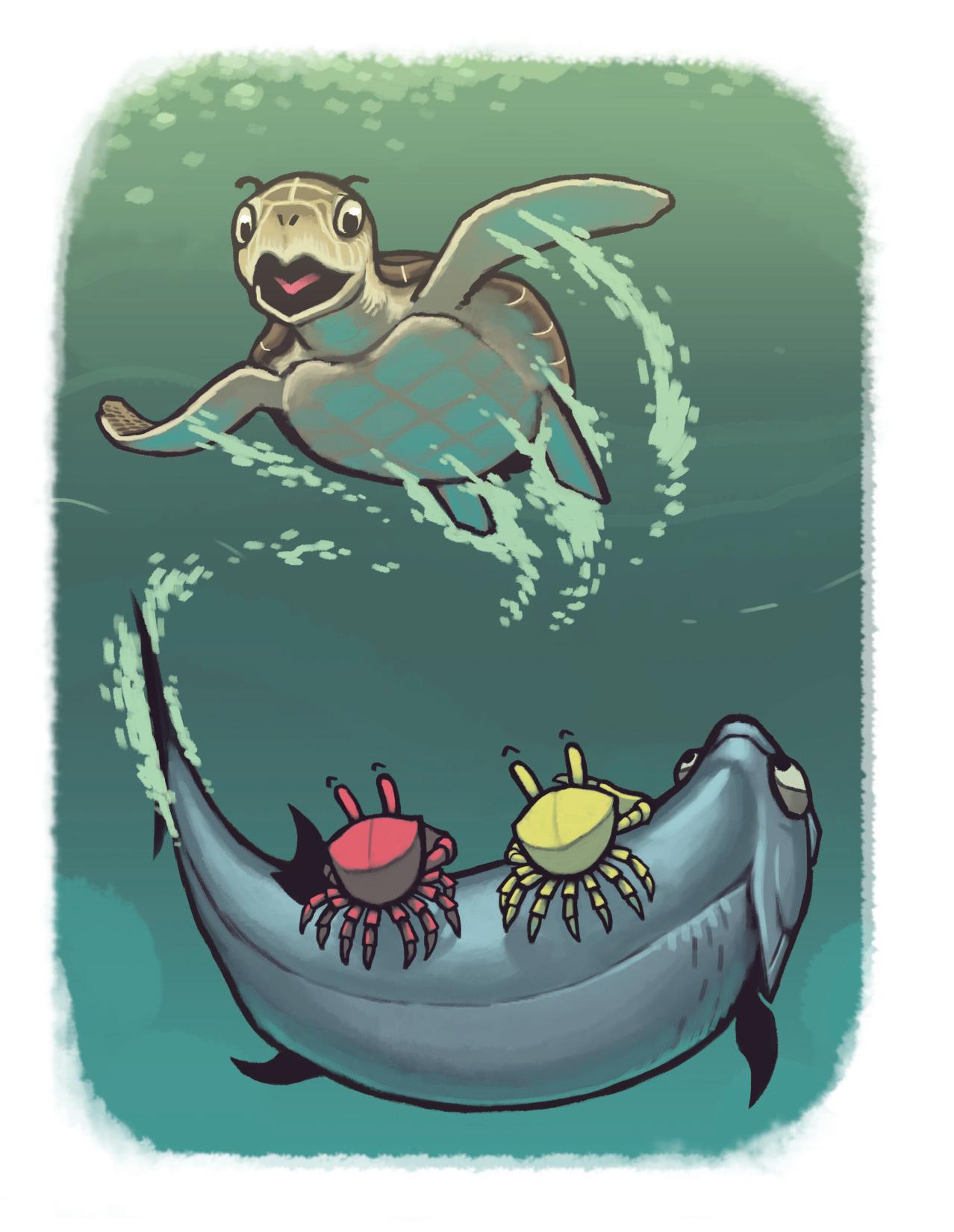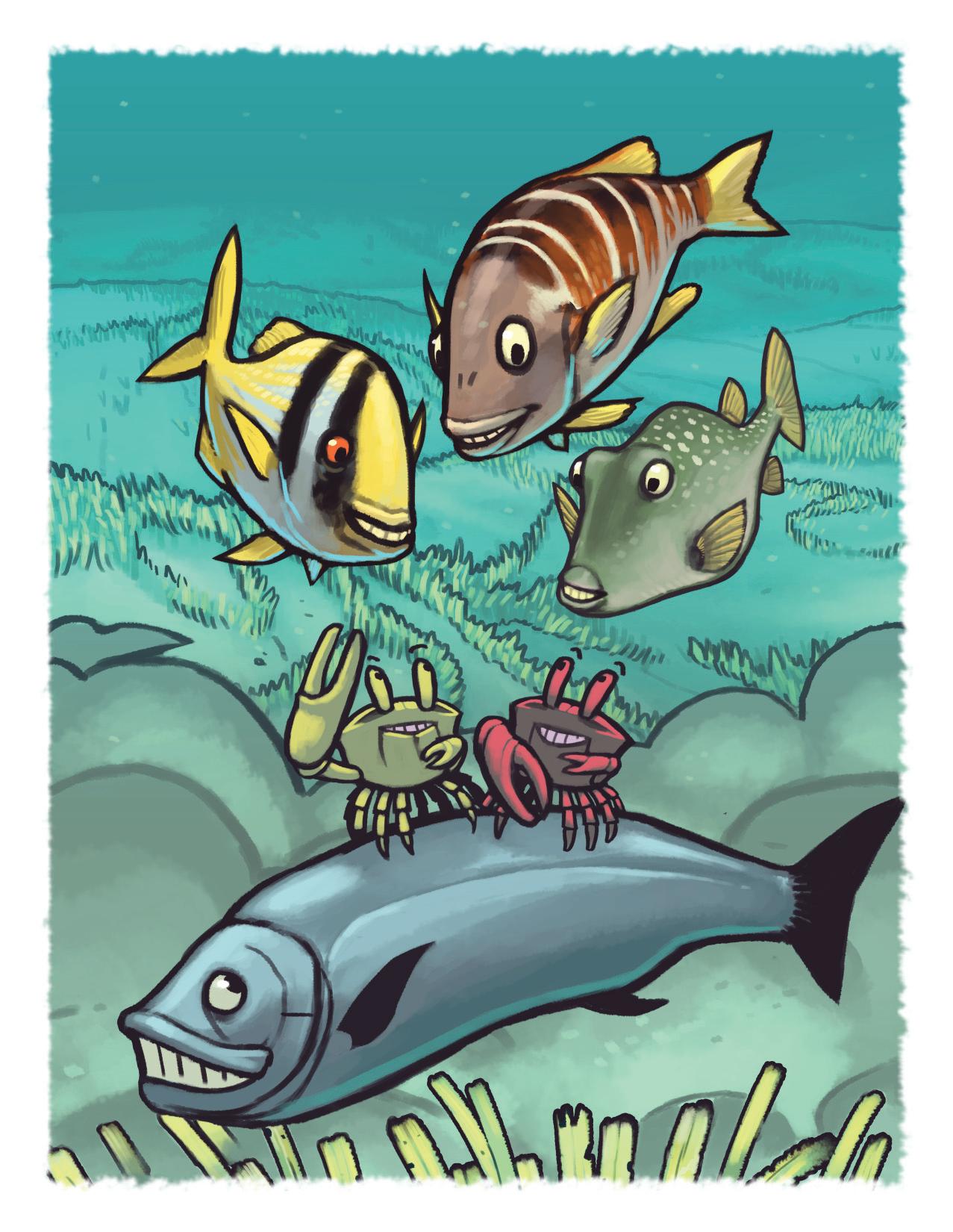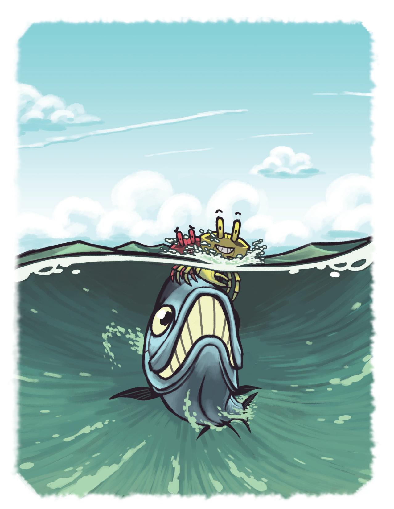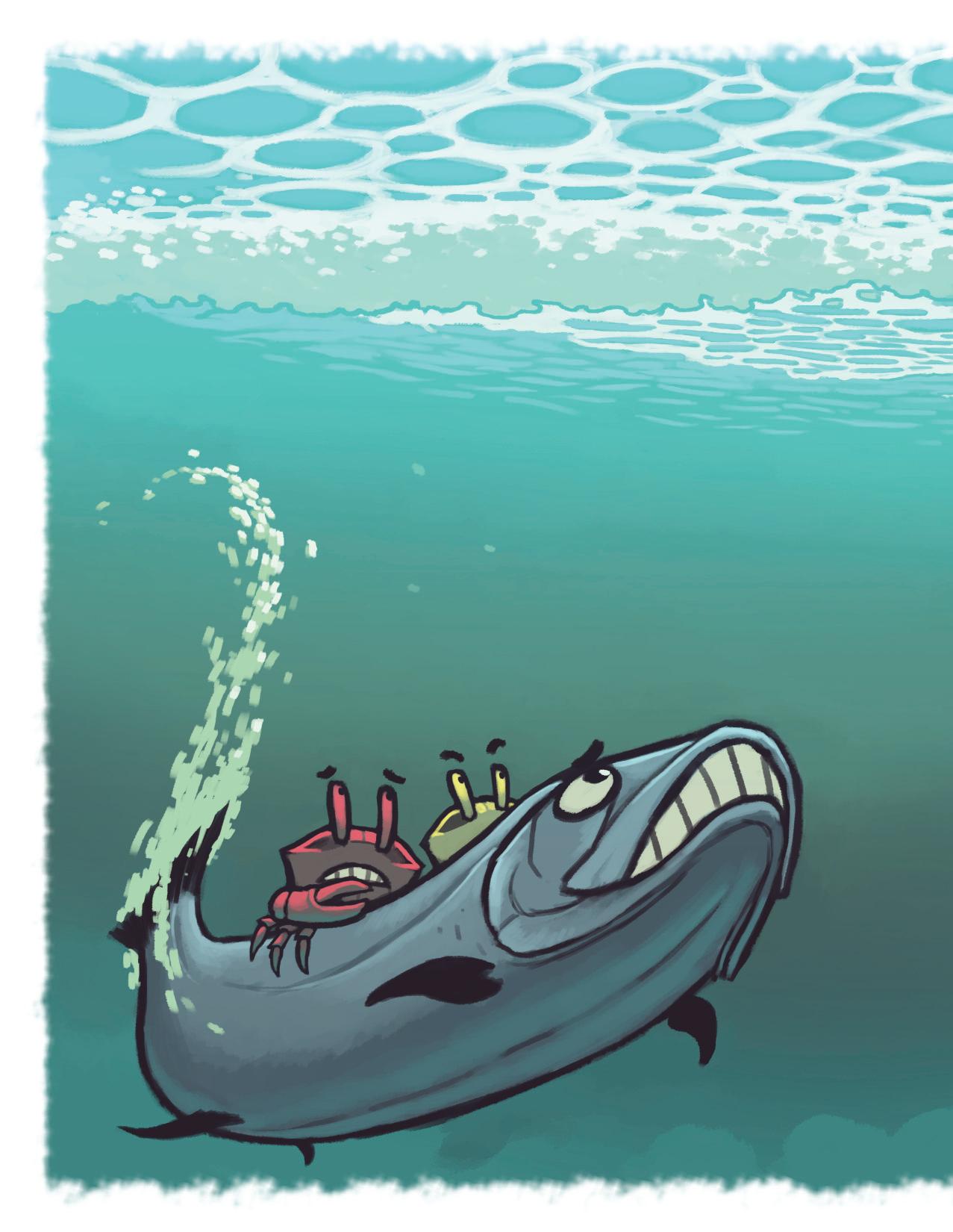 Dicho esto, Pepe y Lulo se subieron sobre el pez. Éste nadaría cerca de la superficie para que los cangrejos violinistas pudieran viajar con la mayor parte de su cuerpo fuera del agua.