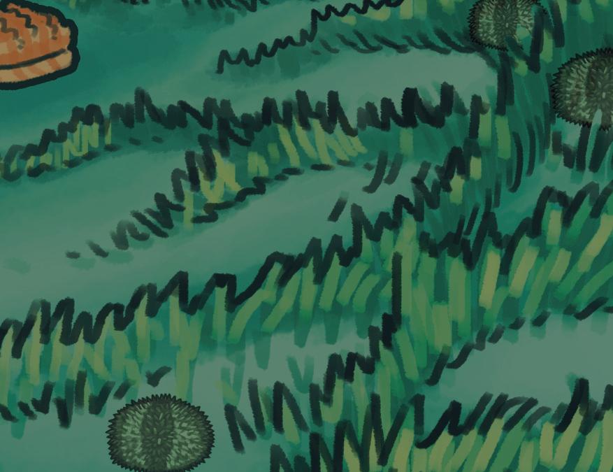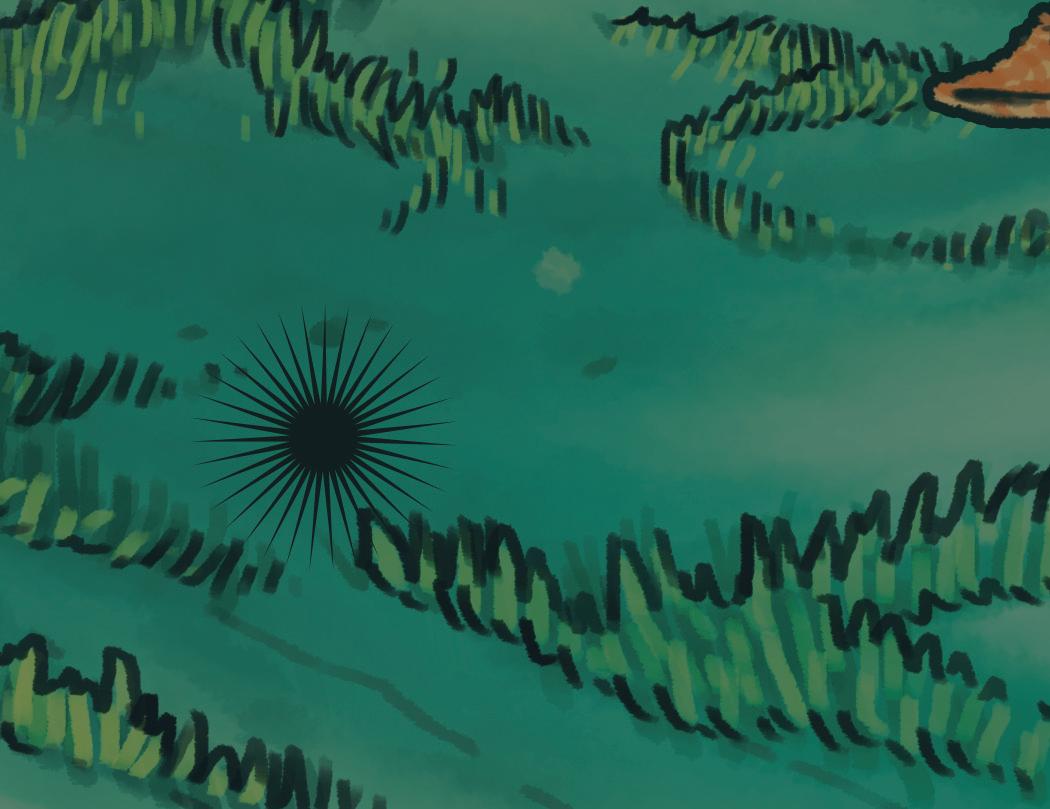 Cuando van entrando a la pradera, se quedaron atónitos por todo lo que veían. Pepe y Lulo nunca habían ido a las hierbas marinas ni habían visto tantas especies que allí habitan. Lo primero que vieron fue un manatí enorme comiendo de las hierbas de manatí. Luego, entre las hierbas, vieron pepinos de mar, estrellas de mar muy coloridas, erizos blancos muy grandes, guanábanos, almejas, anémonas, samas y mantarrayas que se desplazaban con gran destreza.