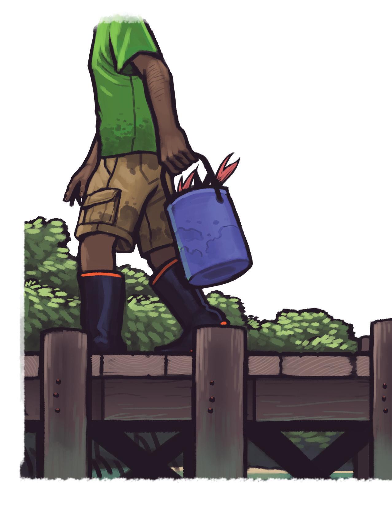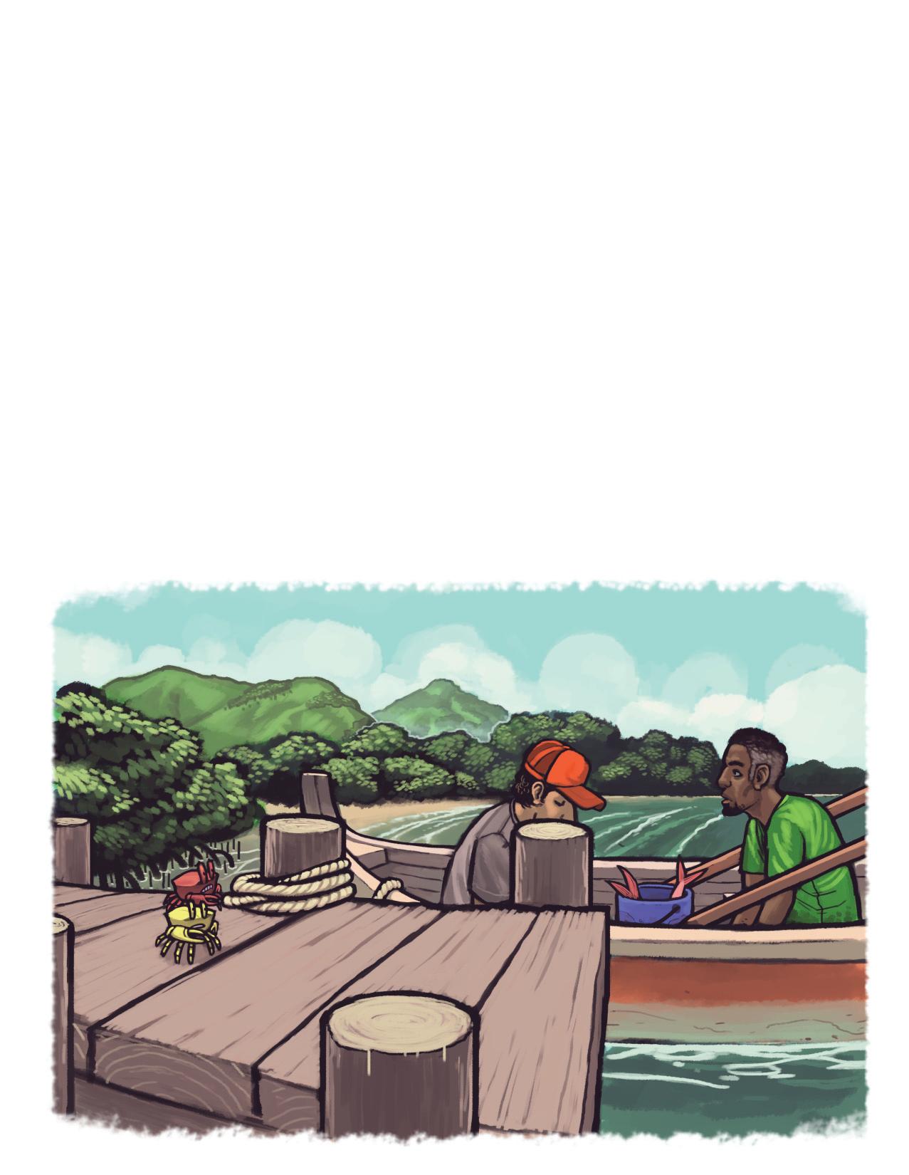 Cuando vinieron a darse cuenta, estaban caminando sobre un muelle que se encontraba cerca del manglar de Pepe y escucharon diferentes voces que hablaban y reían. Lulo, todavía adolorido, corrió asustado y se escondió detrás de uno de los pilotes del muelle.