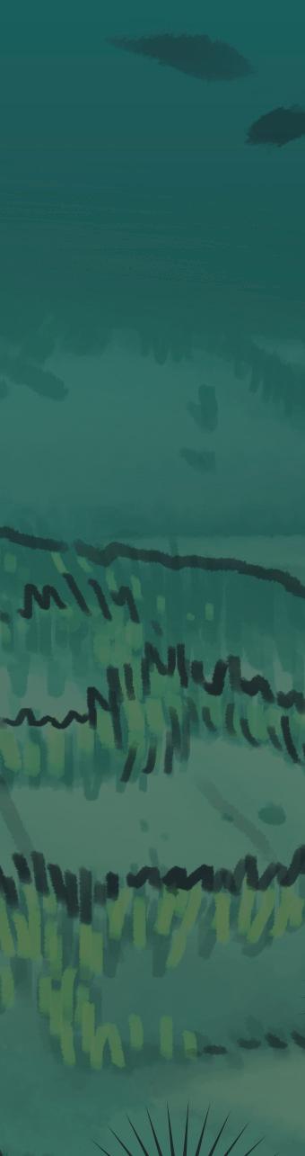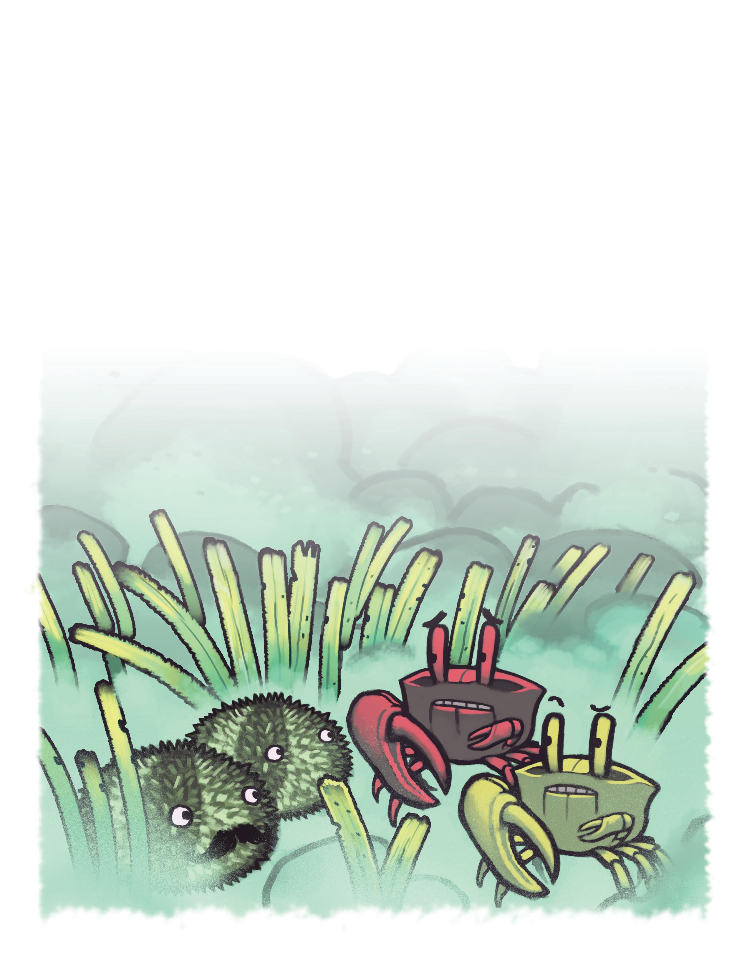 Saltaba y bailaba de alegría porque lograron sobrevivir. Sin embargo, un grupo de erizos verdes se acercó y les dijeron: —¿Ustedes saben que esta agua turbia que los salvó, provoca la muerte de nuestro hogar? Los sedimentos que se acumulan no permiten pasar la luz del sol y las hierbas no pueden crear su propio alimento.