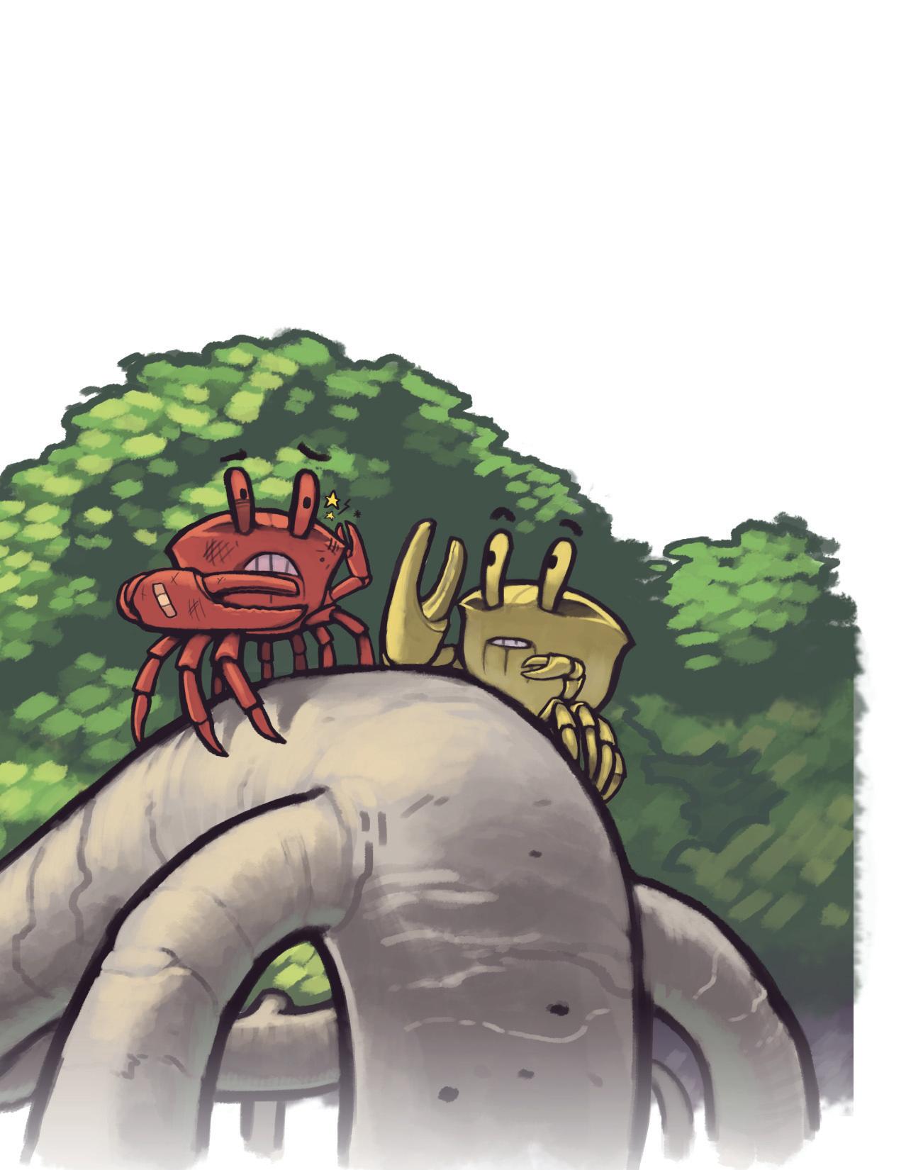 ¡Saludos! ¡Mamiii! Soy Lulo y también soy un cangrejo violinista. Sin embargo, tengo un nombre diferente al de mi amigo Pepe: Uca burgersi. Me asustan mucho las cosas nuevas, pero siempre intento hacerlas. Tengo un color rojizo y en los manglares de Puerto Rico soy menos común que Pepe. Al igual que mi amigo, los machos de mi especie tenemos una quela más grande que la otra. Con los túneles que hacemos para nuestras casas, ayudamos a que llegue más aire a las raíces de los árboles de mangle. Así los árboles crecen más felices y saludables.