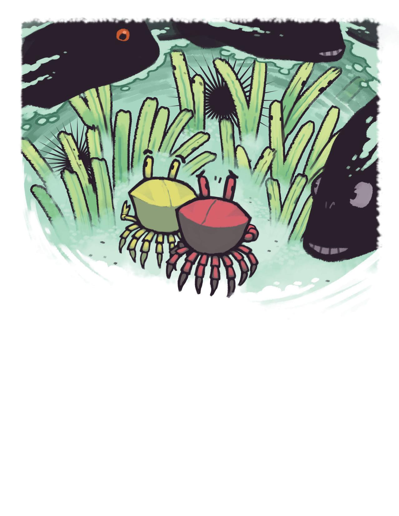 Luego de saludarse efusivamente, los cangrejos le contaron que venían a advertirles que iban a destruir esa pradera para construir una playa artificial y que necesitaban hacer algo. En ese momento, Giga, un carrucho que se encontraba allí con todas sus crías, les dice: —Ya hay seres humanos que están tratando de evitar que esto pase, como las vedas que también han puesto para que yo pueda tener muchos hijitos. Varias agencias gubernamentales, universidades y grupos ambientales han sacado la cara por nosotros. Espero que los demás seres humanos se unan y respeten esas vedas y aprendan a valorar nuestro hogar tal y como está.