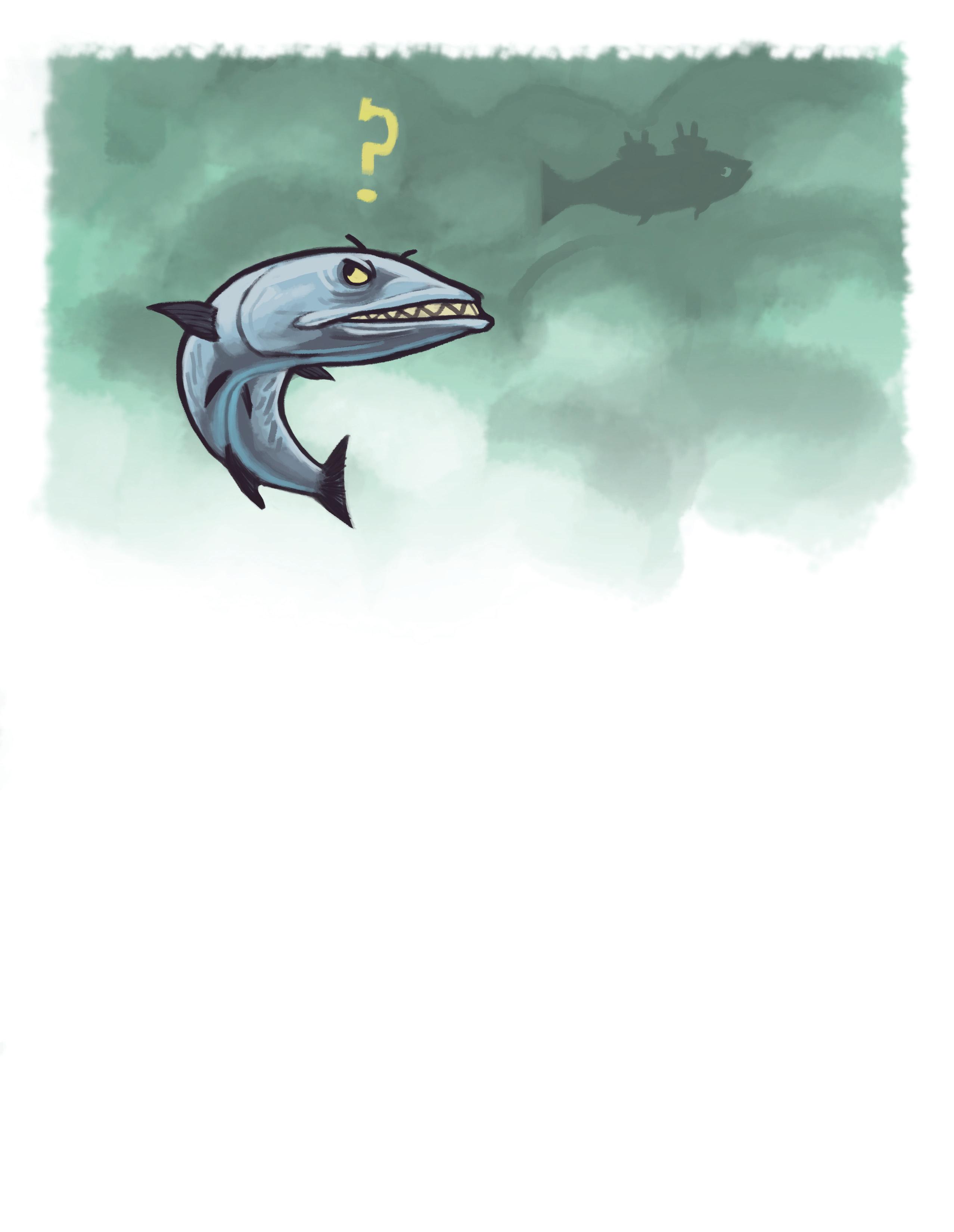 Al escuchar el grito de Lulo, Pepe volteó rápidamente y vio una picúa que los asechaba. Entonces Megalo nadó lo más rápido que pudo y la picúa se lanzó tras ellos.