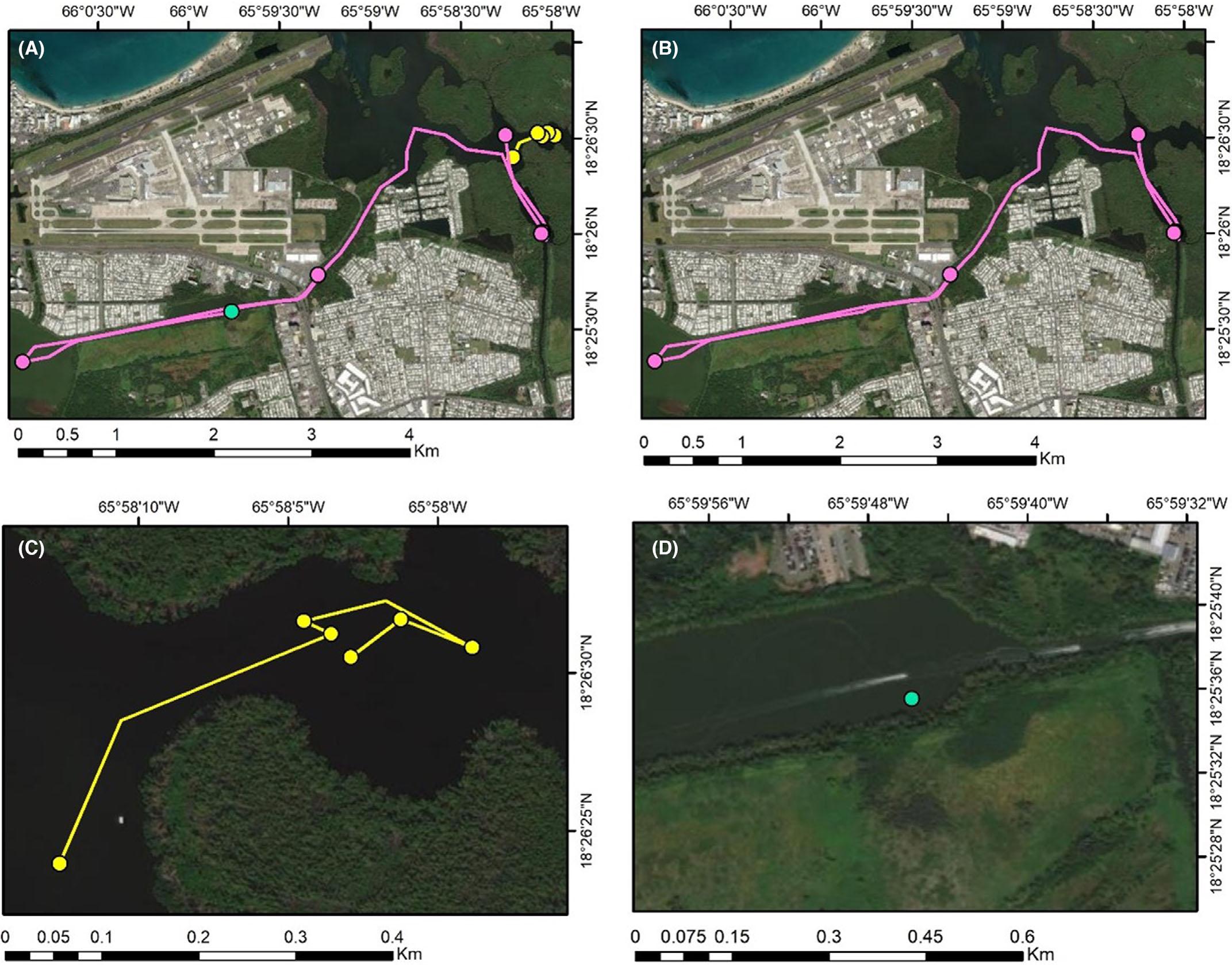 FIGURE2.Examplesof fishmovementandstatusclassificationasalive,dead,orcensoredbasedonrules. (A) Comparativemapofallthree classificationsrepresentedbypanels(B–D). (B) Fishconsideredalivebecauseofsignificantlymovementafter5d. (C) Fishconsidereddead,asit movedfromtheinitialsiteofcapturebutdidnotmovesignificantlyfollowingthe5-devaluationperiod. (D) Fishunabletobeclassifiedandcensored fromanalyses.MapswereproducedbyKaroldCoronado-Franco.