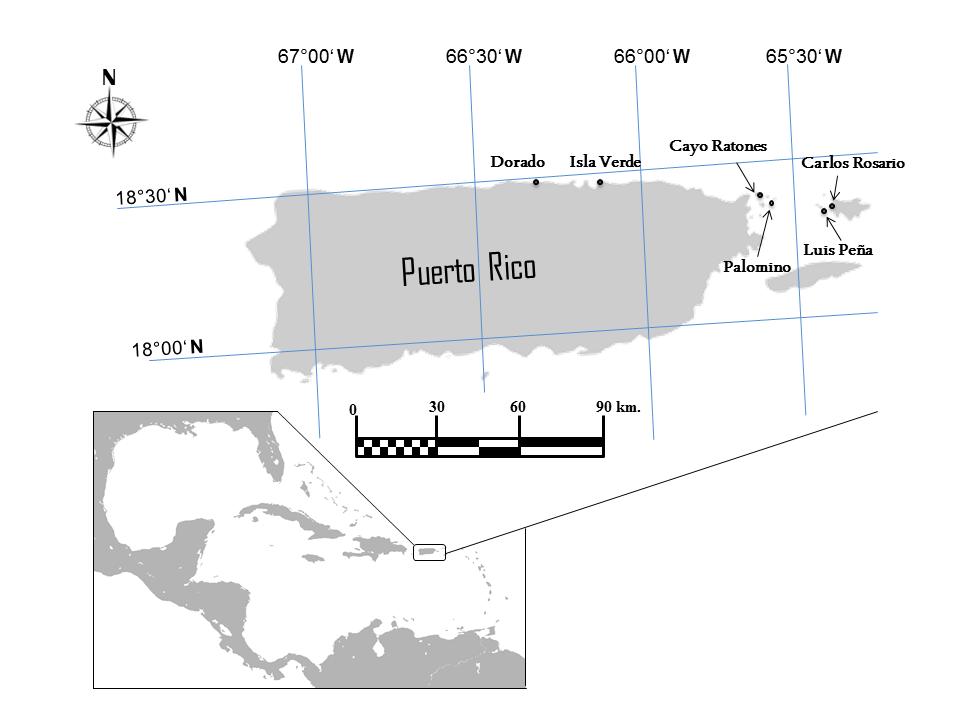Fig 7. Map showing the six study sites originally selected. Two in the north coast [Dorado (DRD) and Isla Verde (IVD)], two in La Cordillera [Cayo Ratones and Palomino (PLM)], and two at Culebra [Luis Peña (LPN) and Carlos Rosario (CRS)]. The Cayo Ratones sites was eliminated due to safety issues.