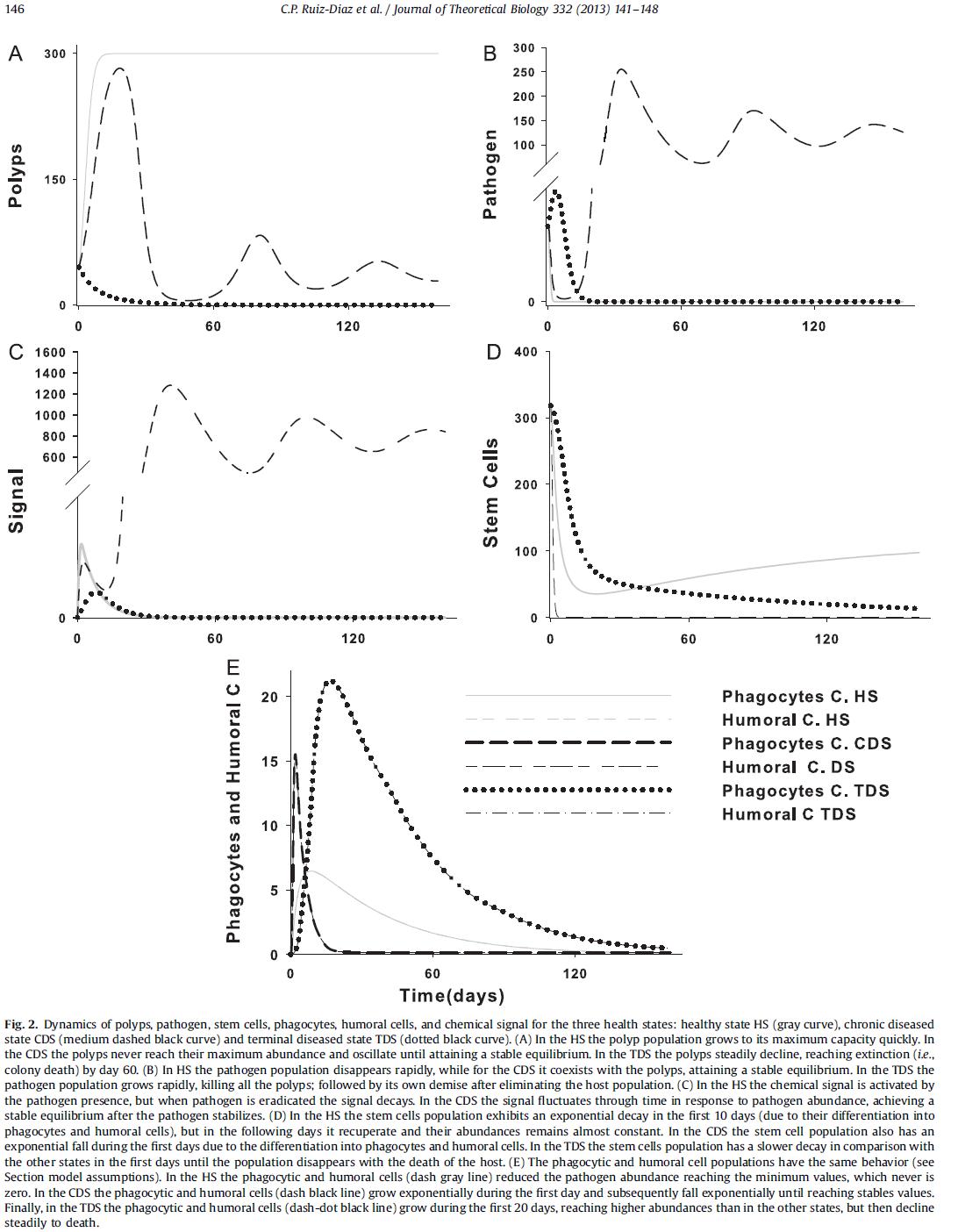 Fig. 4. Dynamics of polyps, pathogen, stem cells, humoral cells and chemical signal for different health states (RuizDiaz et al. 2013).