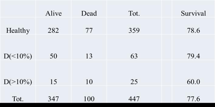 health categories: healthy, diseased with severity <10%, and diseased with severity > 10%. Chi-square=4.76, df =2, p=0.093.