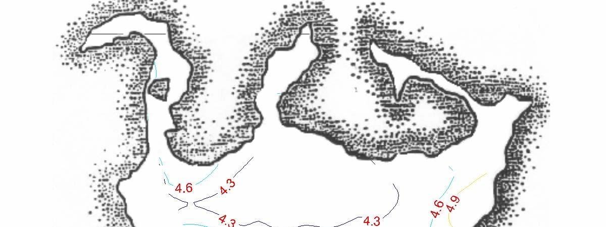 The following displays the depth of water throughout the Phosphorescent Bay. It should be noted that the commercial boats enter the bay and do a loop around the East half of the bay where the water is deepest. This is rather important as it appears to effect some of the ecological indicators that are measured below.