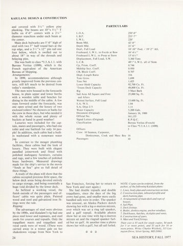 NOTE: Copies can be ordered, from the author, of thefollowing Kaiulani plans: I. Lines, body plan and construction section. 2. Construction plan, inboard profile and deck framing plan. 3. Arrange111ent of main deck and tops of houses. 4. Sail Plan. 5. Deckfirtings. 6. Boiler, donkey engine, anchor windlass. 7. Deckhouse, hatches, skylights and vents. 8. Construction ofspars. 9. Mast and Yard fittings. Their cost is $5 each for single copies, $4 each for 5 or 111ore prints, and $3 each for JO or more prints. Write: Charles Wittholz, 315 Lexing1on Drive, Silver Spring, MD20901.