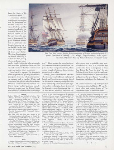 Clark, er al., eds. Naval Documents of the American Revolution, I 0 vols. to dare (Was hin gto n DC: US Government Printing Office, 1964-), 7: 183, 935. H ereafter NDA R; John Paul Jon es to the Presid ent of Co ngress, 7 December 1779, Papers of the Continental Co ngress, item 168, vo l. 2: 107, Natio nal Archives, Washington DC. H ereafter PCCand DNA. 3. Robert Morris to Jones, 5 Feb. 1777, NDAR, 7: 1109. 4. Jones to Robert Morris, 17 Oct. 1776, NDAR, 6: 1302. 5.JonestoJohn Brown,3 1Oct.1777, NDAR, 10: 362. 6. Jones to the Continental Marine Committee, 10 December 1777, item 58, p. 137, DNA. 7. Jones to W illi am Carmi chael, 13 Feberuary 1778, (H enry Hu ntin gto n Library, San Marino CA) a nd 14 Februa ry 1778, D NA; Jon es to the Cont inenta l Marin e Committee, 22 February 1778, PCC, item 58, p. 143, DNA. 8. American Comm issioners to Jones, 16 Jan uary 1778, PCC, DNA; Jo nes to the America n Com missioners in France, 5 D ecember 1777, D A. 9. Jones to the Continental Marine Com mittee, 22 February 1778, DNA. l 0. Morison, Jones, p. 162. 11 . Jones to the Countess of Selki rk, 8 May 1778, PCC, item 168, vol. I: 75, D NA. 12. Ezra Green , "Diary of Dr. Ezra Gree n," entry of 24 Apri l, JPJ and the Ranger. (Porrsmo urh , N.H., Portsmouth Marine Society, 1994), p. 205. Hereaf-