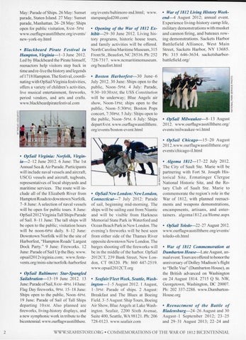 •Algoma 1812-17- 22 July 20 12. The City of Sau lt Ste. Marie wi ll be 2 ~--~3111--_JlJ ~ partnering with Fort St. Joseph His~ torical S ite , Ermati nger C lergue ~ National Historic Site, and the Rotary Club of Sau lt Ste. Marie to • OpSail New London: New London, commemorate the region 's role in the Connecticut-? July 2012 : Parade War of 1812, with planned reenactof sail, beginning mid-morning. The ments and weapons demonstrations, ships will be sailing east from Niantic encampments, artisans, and enterand will be visible from Harkness tainers . a lgoma 1812.ca/Home.aspx Memorial State Park in Waterford and Ocean Beach Park in New London. The • OpSail Toledo-22- 27 August 2012. evening 's fireworks will be best seen www.ourflagwassti1 1there.org/events/ from either side of the Thames River toledo-oh.html opposite downtown New London. The barges shooting off the fireworks will • War of 1812 Commemoration at be in the middle of the harbor. OpSail Dumbarton House- Late August, an20 I 2CT, 239 Bank Street, New Lon- nual event. Tours are offered to honor the don, CT 06320. Ph: 860 447-2519. ann iversary of Doll ey Madison 's flight to "Belle Vue" (Dumba1ton House), as www.opsai12012CT.org the British advanced on Washington • Sea/air/Fleet Week, Seattle, Wash- on 24 August 1814. 2715 Q St. NW, ington- 1- 5 August 2012. I August, Georgetown, Wash ington, DC 20007. l- 3PM : Parade of ships . 2 August: Ph: 202 337-2288. www.D umbartonBreakfast and The Blues at Boeing House.org Field. 3- 5 August: Ship Tours, Boeing Air Show, Blue Angels at Lake Wash- • Reenactment of the Battle of ington. Seafair, 2200 Sixth Avenue, Bladensburg- 24- 26 August and 30 Suite 400, Seattle, WA 98121. Ph: 206 August- I September 2012; 23- 25 728-0123. www.seafair.com and 29- 31 Augu st 2013; 22- 24 and