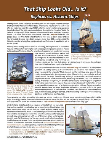 Reading about sailing ships in books is one thing, hauling on lines to raise sails, heaving in the anchor, learning to walk across a pitching deck is another. People build replicas of historic ships for a number of reasons, but usually it is because that type of vessel no longer exists and, without a full-size ship to explore, under- Mayflower II was built in 1957 as a replica of the original ship that carried the Pilgrims standing what it was like is hard to do. Not to the New World in 1620. all ships you see at tall ship festivals are replicas—some are the real deal, others are somewhere in between, depending on how much they have been repaired and rebuilt.