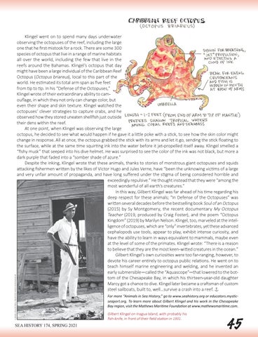 Klingel went on to spend many days underwater observing the octopuses of the reef, including the large one that he first mistook for a rock. There are some 300 species of octopus that live in a range of marine habitats all over the world, including the few that live in the reefs around the Bahamas. Klingel’s octopus that day might have been a large individual of the Caribbean Reef Octopus (Octopus briareus), local to this part of the world. He estimated its total arm span as five feet from tip to tip. In his “Defense of the Octopuses,” Klingel wrote of their extraordinary ability to camouflage, in which they not only can change color, but even their shape and skin texture. Klingel watched the octopuses’ clever strategies to capture crabs, and he observed how they stored uneaten shellfish just outside their dens within the reef. At one point, when Klingel was observing the large octopus, he decided to see what would happen if he gave it a little poke with a stick, to see how the skin color might change in response. All at once, the octopus grabbed the stick with its arms and let it go, sending the stick floating to the surface, while at the same time squirting ink into the water before it jet-propelled itself away. Klingel smelled a “fishy musk” that seeped into his dive helmet. He was surprised to see the color of the ink was not black, but more a dark purple that faded into a “somber shade of azure.” Despite the inking, Klingel wrote that these animals, thanks to stories of monstrous giant octopuses and squids attacking fishermen written by the likes of Victor Hugo and Jules Verne, have “been the unknowing victims of a large and very unfair amount of propaganda, and have long suffered under the stigma of being considered horrible and exceedingly repulsive.” He thought instead that they were “among the most wonderful of all earth’s creatures.” In this way, Gilbert Klingel was far ahead of his time regarding his deep respect for these animals; “In Defense of the Octopuses” was written several decades before the bestselling book Soul of an Octopus (2015) by Sy Montgomery, the recent documentary My Octopus Teacher (2019, produced by Craig Foster), and the poem “Octopus Kingdom” (2019) by Marilyn Nelson. Klingel, too, marveled at the intelligence of octopuses, which are “only” invertebrates, yet these advanced cephalopods use tools, appear to play, exhibit intense curiosity, and have the ability to learn in ways equivalent to mammals, maybe even at the level of some of the primates. Klingel wrote: “There is a reason to believe that they are the most keen-witted creatures in the ocean.” Gilbert Klingel’s own curiosities were too far-ranging, however, to devote his career entirely to octopus public relations. He went on to teach himself marine engineering and welding, and he invented an early submersible—called the “Aquascope”—that lowered to the bottom of the Chesapeake Bay, in which his thirteen-year-old daughter Marcy got a chance to dive. Klingel later became a craftsman of custom steel sailboats, built to, well…survive a crash into a reef.