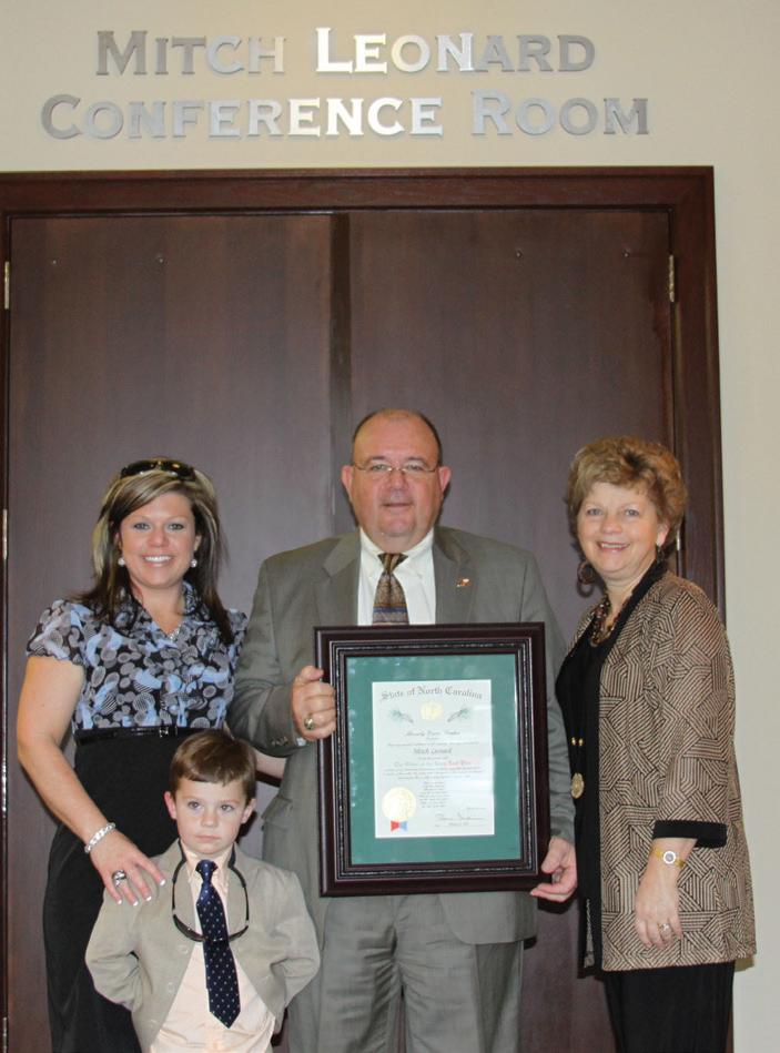 Executive Director Mitch Leonard stands with his wife Lorraine, daughter Leighann and grandson Anderson after receiving the Order of the Long Leaf Pine in February 2012 in front of the conference room that bears his name.