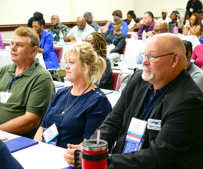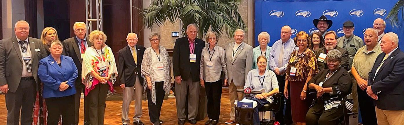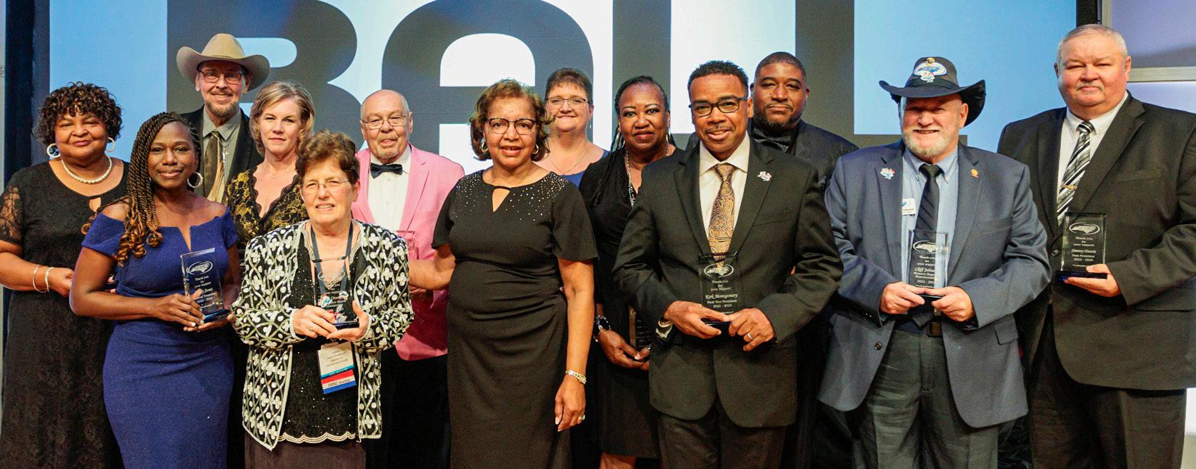 2022-23 Executive Committee Awards. (Left to right) North Central Region Representative Janet Bunch, Treasurer Emily Jones, Piedmont Region Representative Cliff Brown, Eastern Region Representative Kathy Merritt, Insurance Board Chairwoman Laura Overstreet, Retiree Council Chairman Benny Brigman, President Martha fowler, Parliamentarian Kim Martin, Parliamentarian Joyce B. Shaw, First Vice President Kirk Montgomery, Second Vice President Wendell Powell, Western Region Representative Cliff Johnson, and Immediate Past President Jimmy Davis.