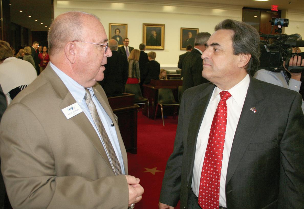 At left is SEANC Legislative Affairs Director Ardis Watkins and N.C. Senate Leader Phil Berger (R-Rockingham) on the General Assembly’s opening day on Jan. 9. Below, SEANC Lobbyist Mitch Leonard (left) talks to Sen. Bob Rucho (R-Mecklenburg) about the upcoming session.