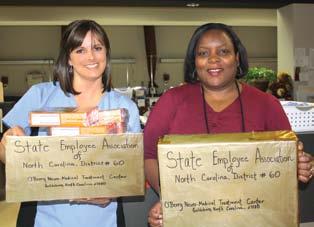 Pictured is District 6 member Deb White showing off one of the prizes given away at the raffle. The event was held in the employee cafeteria at Broughton Hospital and featured door prizes including stuffed animals, baskets and candy to members who attended.