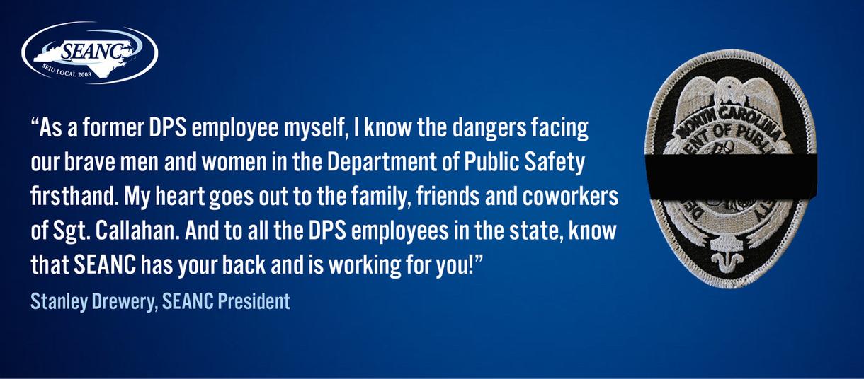 “As a former DPS employee myself, I know the dangers facing our brave men and women in the Department of Public Safety firsthand,” Pres. Drewery said. “My heart goes out to the family, friends and coworkers of Sgt. Callahan. And to all the DPS employees in the state, know that SEANC has your back and is working for you!”