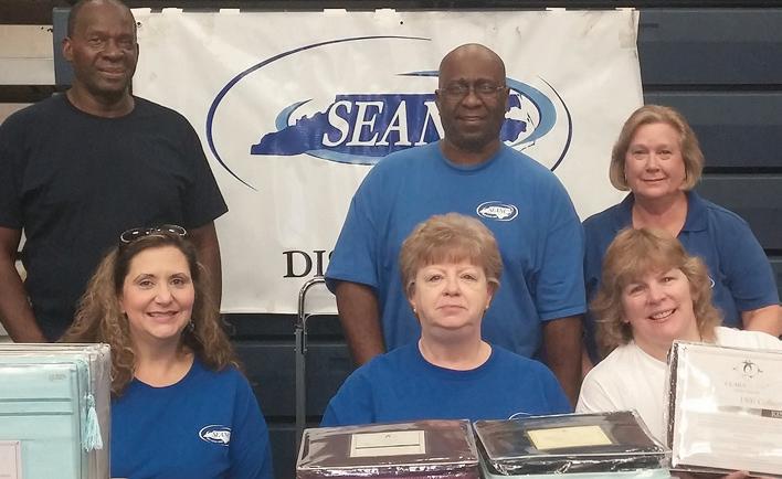 District 6 members Nate Brown, Charles Scruggs, Sherry Helton, Dale Schaffer, Sherry Vines, Pat Ellis and Corona Kanipe (not pictured) sold sheets and Rada products to raise funds for scholarships on Sept. 24 at East Burke High in Burke County.