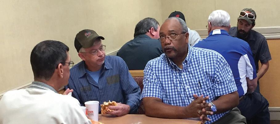 District 8 Chairman Ron Hunt (plaid shirt) and District 8 member Leonard Reynolds (behind him in the blue and white shirt) met with Ashe County DOT employees at Bojangles' in Jefferson on Oct. 5.