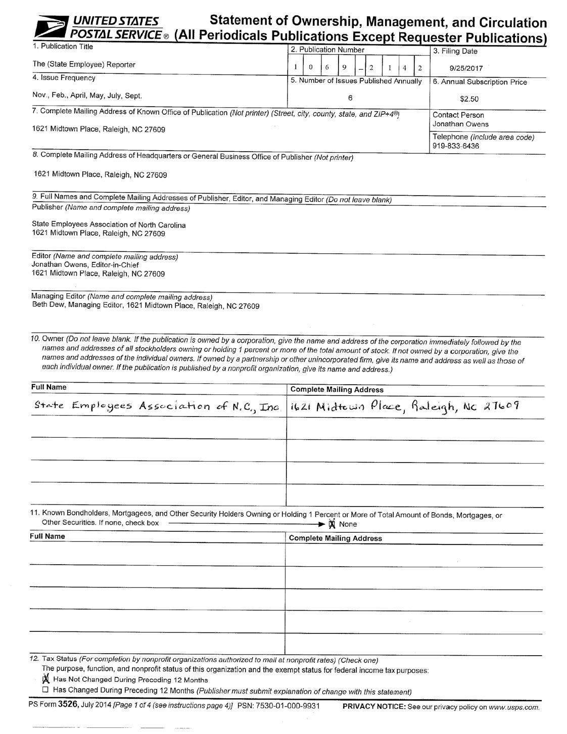 The Reporter, USPS 009-852 (ISSN 1069 2142), is published six times a year in the months of February, April, May, July, September and November for $2.50 per year, per member, by the State Employees Association of North Carolina, Inc., 1621 Midtown Place, Raleigh, NC 27609. Periodicals postage paid at Raleigh and additional offices.
