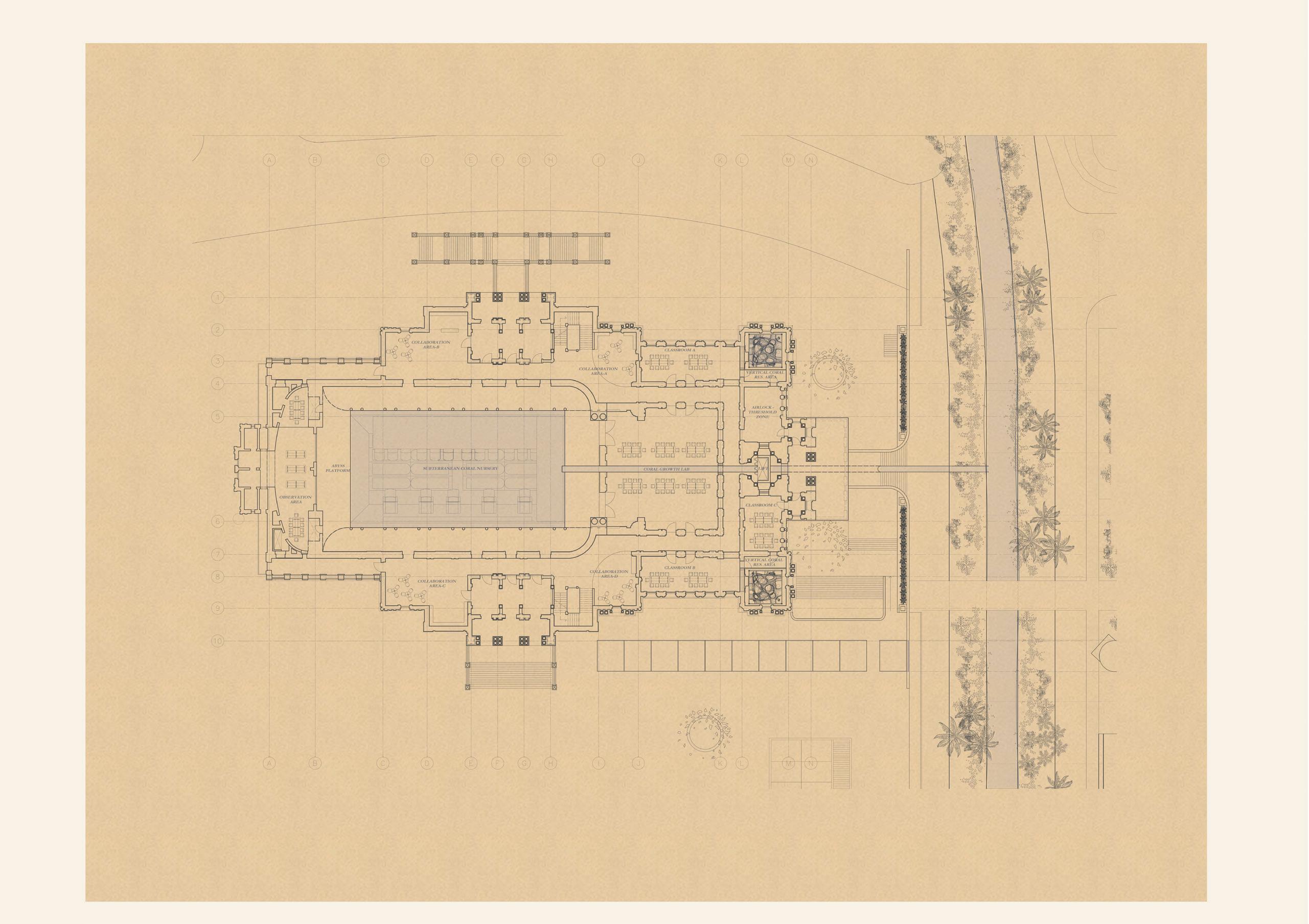 In addition, the Town Hall transfers its existing programme to focus on education and research in coral growth. The (right) enables an intense set of classrooms, lab spaces and vertical coral storage rooms. In contrast, the (left) collaboration and surveillance rooms provide a reprieve from the intensity of the (right) plan.