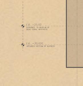 Indicated is a potential location for a new continental shelf for the translation of coral from the Town Hall nursery. In addition, to the conceptual ideas this project evokes, this self will also aid in the barrier of sea-level rise from climate change—a natural sea-wall.