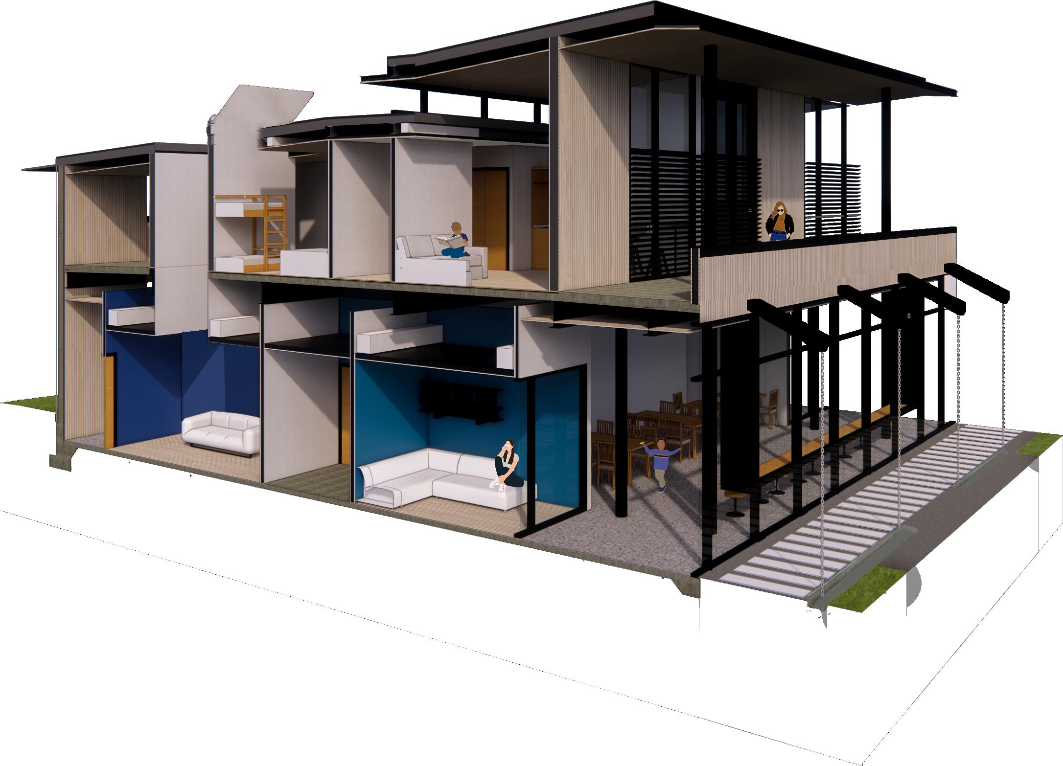 - Corridor interacts with community spaces on each level