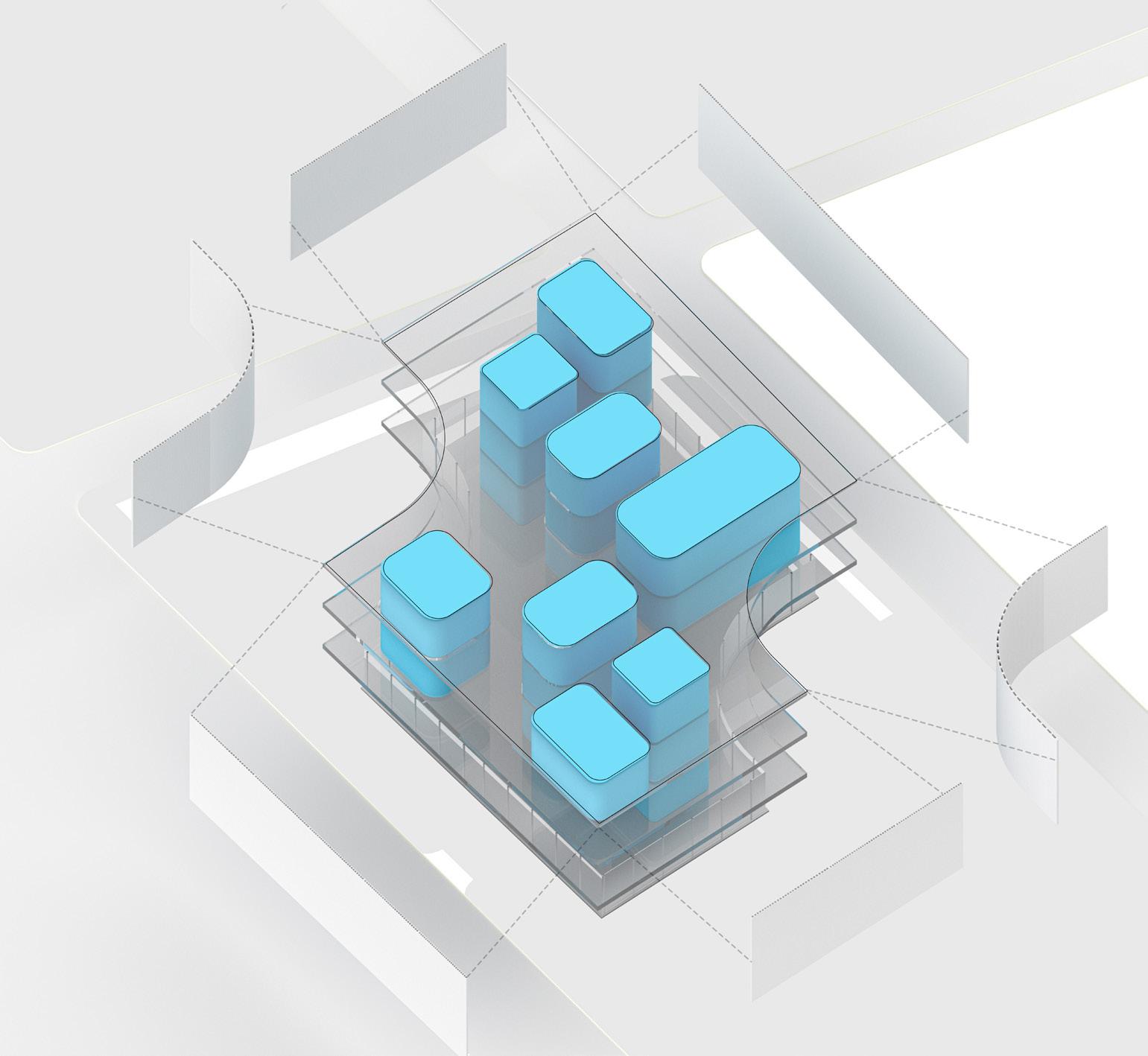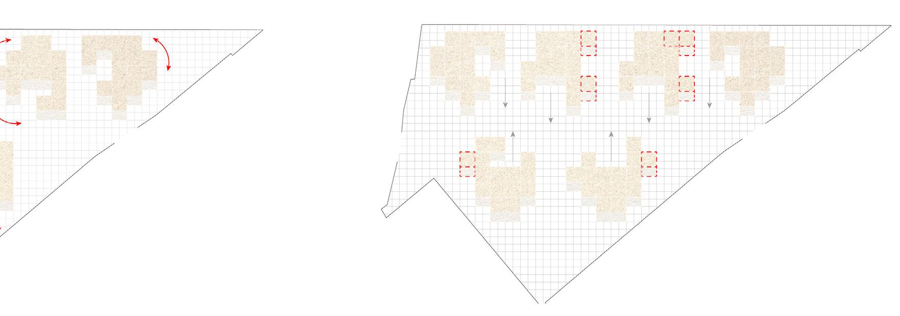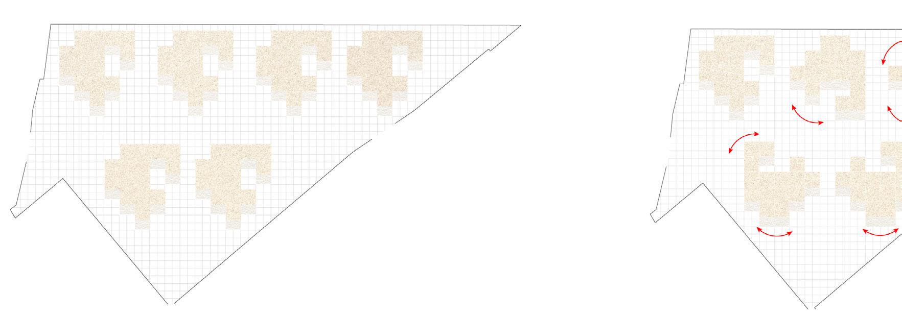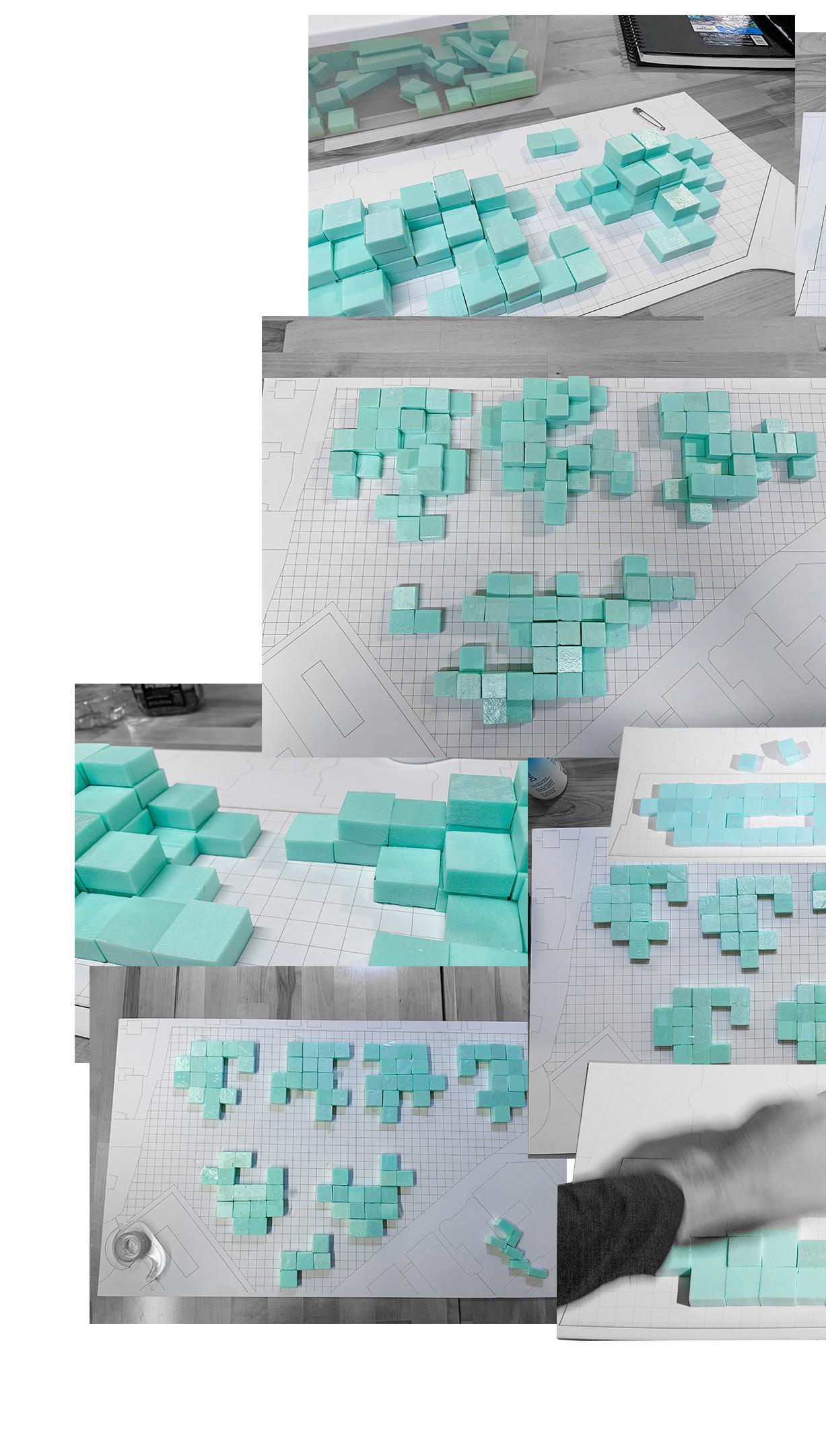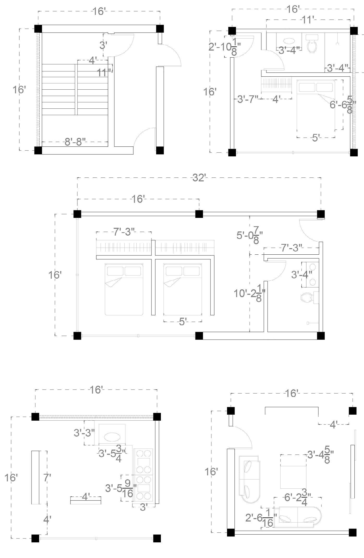 After an investigation of standard room sizes and further calculations related to circulation requirements, a module of 16 feet by 16 feet was standardized throughout the entire project. This 16’x16’ module serves as the basic building block for further aggregations.