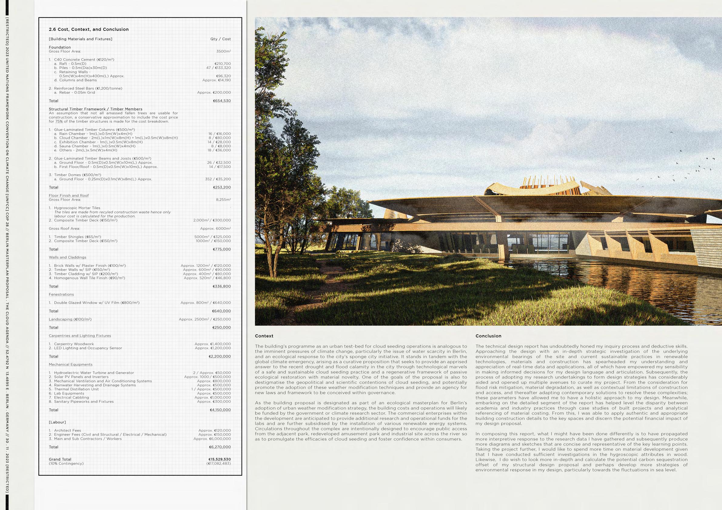 The technical design report investigates the feasibility of designing and constructing an urban cloud seeding research centre along the Spree riverbank at Plänterwald forest in Berlin, Germany. Analyses of the building's structural framework, technical detailing, construction sequence, environmental strategies, operations, construction cost, and legacy were rendered in this supplementary document.
