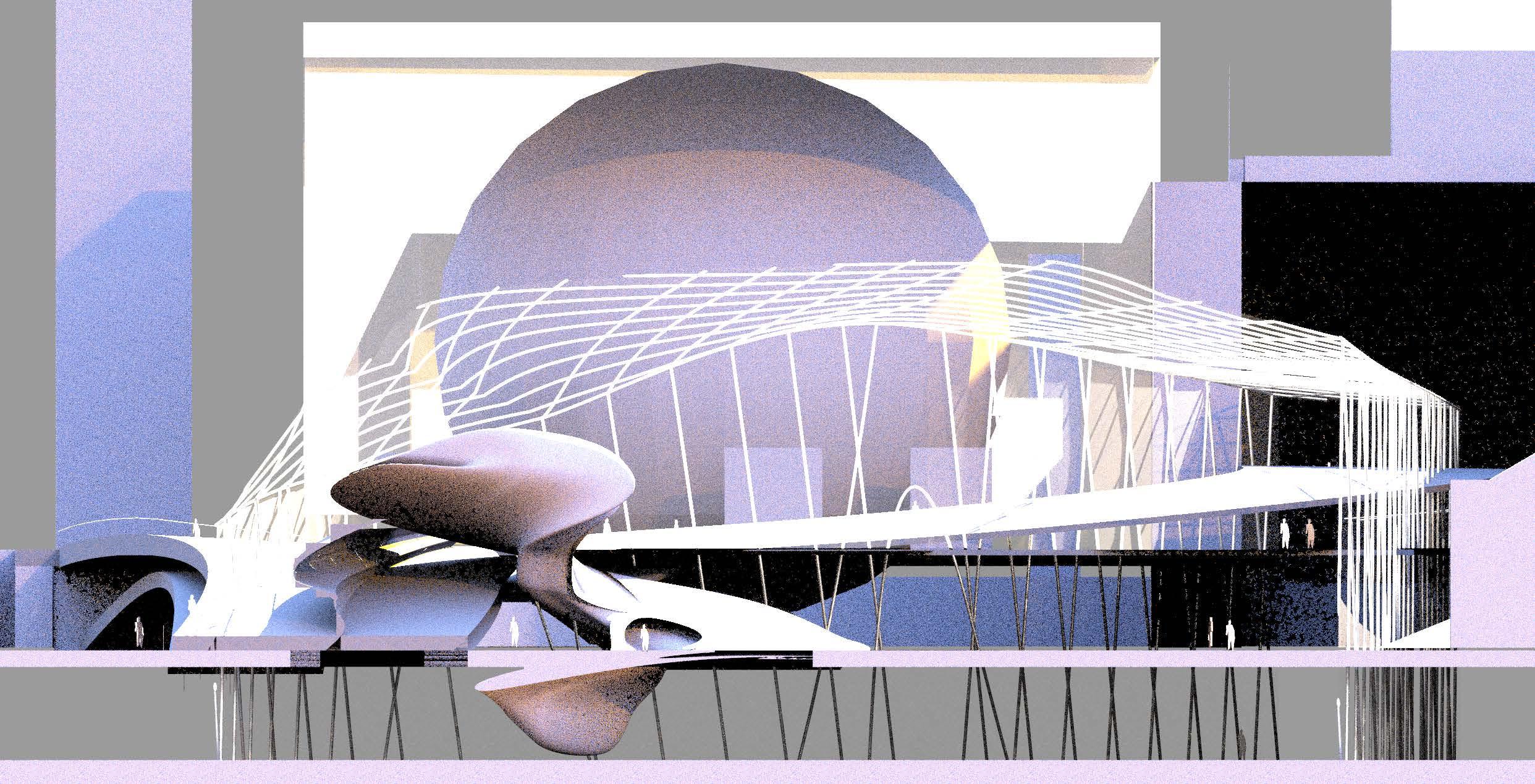 Located on pier 3 in Brooklyn Bridge Park, N.Y. The Brooklyn Heights Performing Arts Center holds a 600 seat theater, as well as an open air performance area to accommodate 2500. The sweeping arch anchored in the pier rises to cradle the theater in reclaimed oak and white pine. The construction of the theater itself being invaluable, is elevated 16’ above grade on the 2nd and third floors to protect against flood damage and create a sustainable installment. Not show in plan, the fourth floor houses a large restaurant with unobstructed views of the lower east side of Manhattan. Covered parking is located in the back of the building, offices are located on the first floor while the kitchen and dressing areas live on the second.