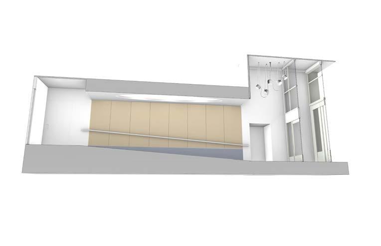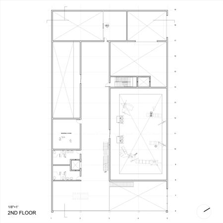 In return the symposium would offer public space in form of a courtyard for the Church. The building to the south, which houses a restaurant, clothing store and artist supply store was parasites over and given access to the public program of the symposium through the lower-level encouraging visitors of both the symposium and retail store to commingle. Housed on the lower level the artist supply store and visitors to the lower-