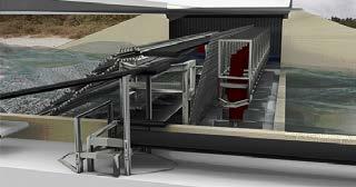 After passing through the bar screens the filtered water is then channeled through hydro turbines before rejoining the river. Dried material can then be shipped up the freight elevators for further processing.