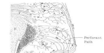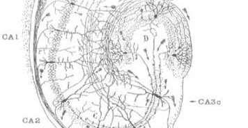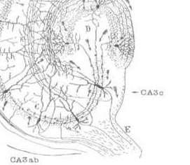 The “seahorse” cross section of hippocampus showing a schematization of core neuralcircuitry, as drawn by the Spanish neuroanatomist Santiago Ramon y Cajal (1899).