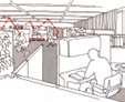 Image illustrating the movement of sound in an open plan office from 1975.The drawing is based on the photograph ofAction Office shown in Figure 6 and uses arrows to show sound produced by individual workers bouncing off of acoustic surfaces which absorb and reduce the overall sound. Source: Robert Propst and Michael Wodka,TheAction Office Acoustic Handbook, 31. Courtesy of Herman MillerArchives.