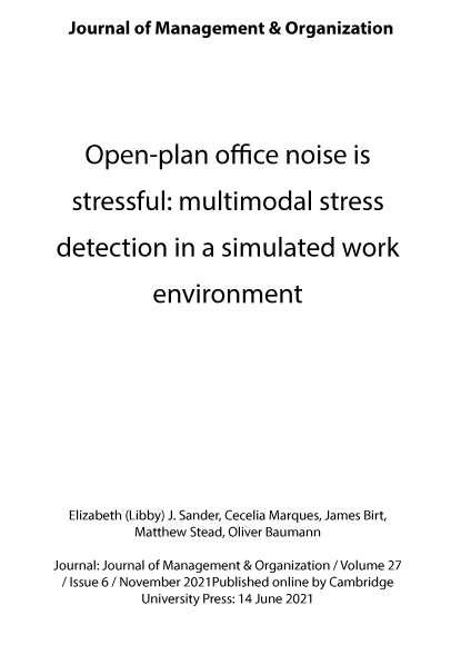 Sander, Elizabeth J., Cecelia Marques, James Birt, Matthew Stead, and Oliver Baumann. 2021. “Open-Plan Office Noise Is Stressful: Multimodal Stress Detection in a Simulated Work Environment.” Journalof Management & Organization 27: 1021–1037. https://doi.org/10.1017/jmo.2021.17.