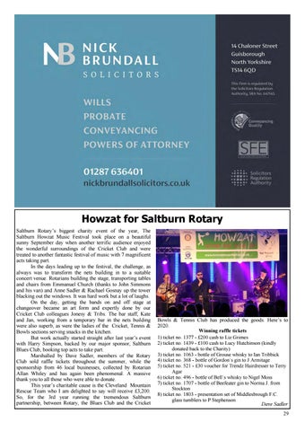 Howzat for Saltburn Rotary Saltburn Rotary‟s biggest charity event of the year, The Saltburn Howzat Music Festival took place on a beautiful sunny September day when another terrific audience enjoyed the wonderful surroundings of the Cricket Club and were treated to another fantastic festival of music with 7 magnificent acts taking part. In the days leading up to the festival, the challenge, as always was to transform the nets building in to a suitable concert venue. Rotarians building the stage, transporting tables and chairs from Emmanuel Church (thanks to John Simmons and his van) and Anne Sadler & Rachael Gosnay up the tower blacking out the windows. It was hard work but a lot of laughs. On the day, getting the bands on and off stage at changeover became an art form and expertly done by our Cricket Club colleagues Jonesy & Tribs. The bar staff, Kate and Jan, working from a temporary bar in the nets building were also superb, as were the ladies of the Cricket, Tennis & Bowls sections serving snacks in the kitchen. But work actually started straight after last year‟s event with Harry Simpson, backed by our major sponsor, Saltburn Blues Club, booking top acts to take part. Marshalled by Dave Sadler, members of the Rotary Club sold raffle tickets throughout the summer, while the sponsorship from 46 local businesses, collected by Rotarian Allan Whiley and has again been phenomenal. A massive thank you to all those who were able to donate. This year‟s charitable cause is the Cleveland Mountain Rescue Team who I am delighted to say will receive £3,200. So, for the 3rd year running the tremendous Saltburn partnership, between Rotary, the Blues Club and the Cricket
