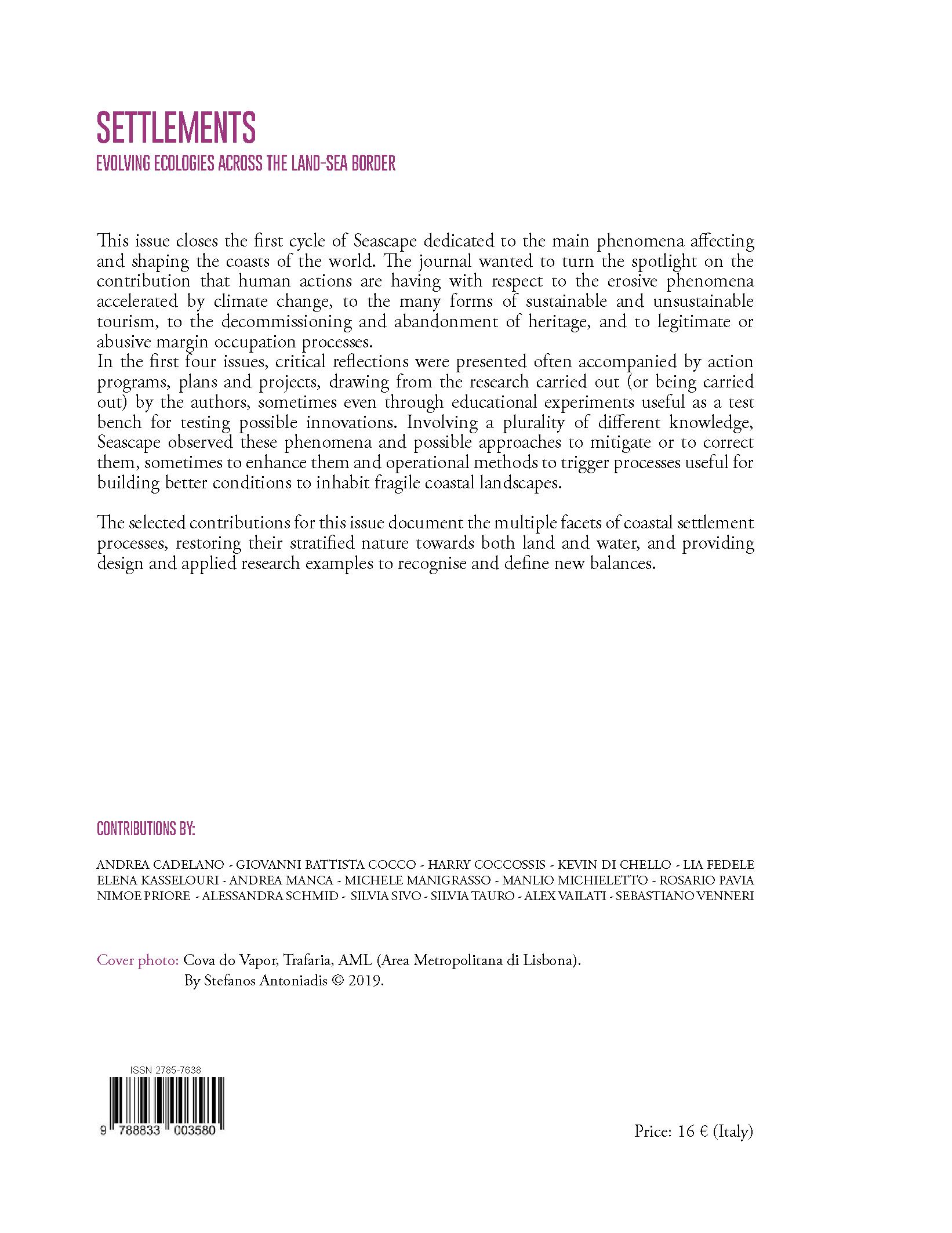 In the first four issues, critical reflections were presented often accompanied by action programs, plans and projects, drawing from the research carried out (or being carried out) by the authors, sometimes even through educational experiments useful as a test bench for testing possible innovations. Involving a plurality of different knowledge, Seascape observed these phenomena and possible approaches to mitigate or to correct them, sometimes to enhance them and operational methods to trigger processes useful for building better conditions to inhabit fragile coastal landscapes.
